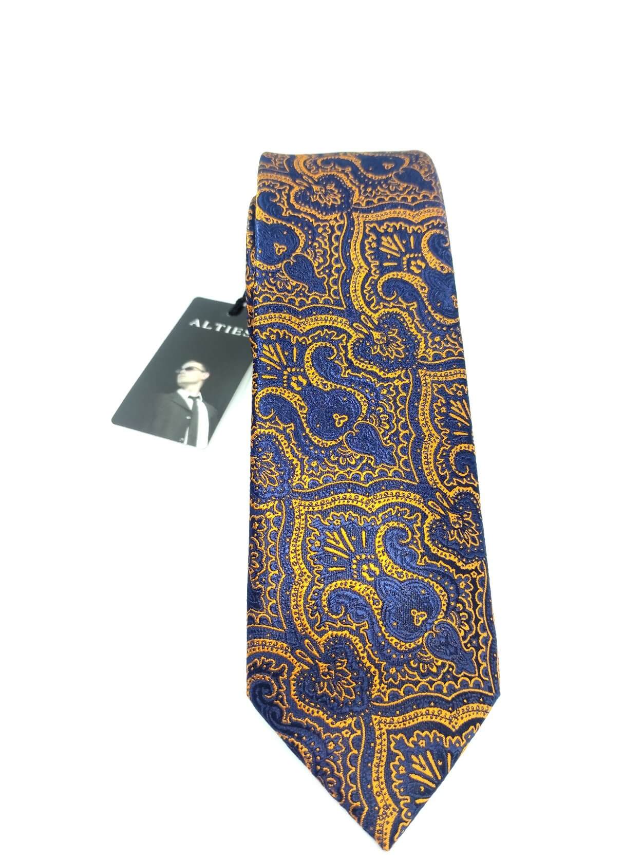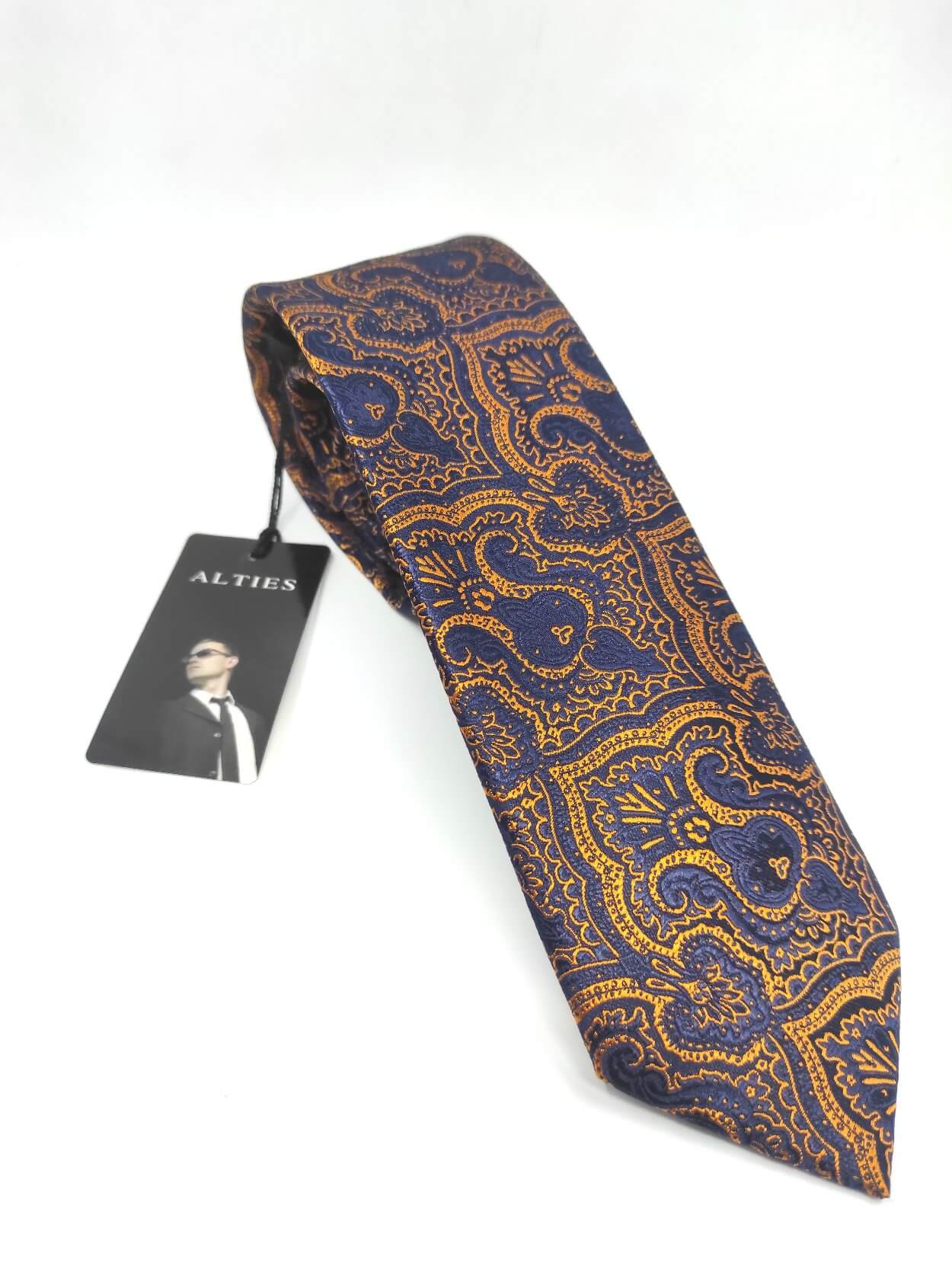 Elegancki krawat męski firmy Alties o klasycznym i modnym kroju,granatowy w miedziany wzór. Krawat o klasycznym i modnym kroju, wykonany z microfibry. Jest on bardzo ważnym elementem ubioru, dzięki któremu każdy mężczyzna może wnieść do swojego stroju odrobinę koloru. Kompletując garderobę należy pamiętać, aby krawat tworzył spójny zestaw z marynarką lub koszulą. Jego unikatowy wzór z pewnością spełni swoją funkcję w połączeniu z różnymi tkaninami w kilku wariantach kolorystycznych. Ponadto wyraźne i mocne akcenty zdobnicze dodadzą charakteru i pozwolą wyróżnić się stylem. Krawat można dobrać zarówno do karnacji, garnituru jak i temperamentu.