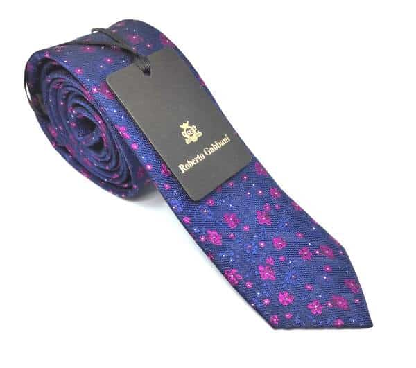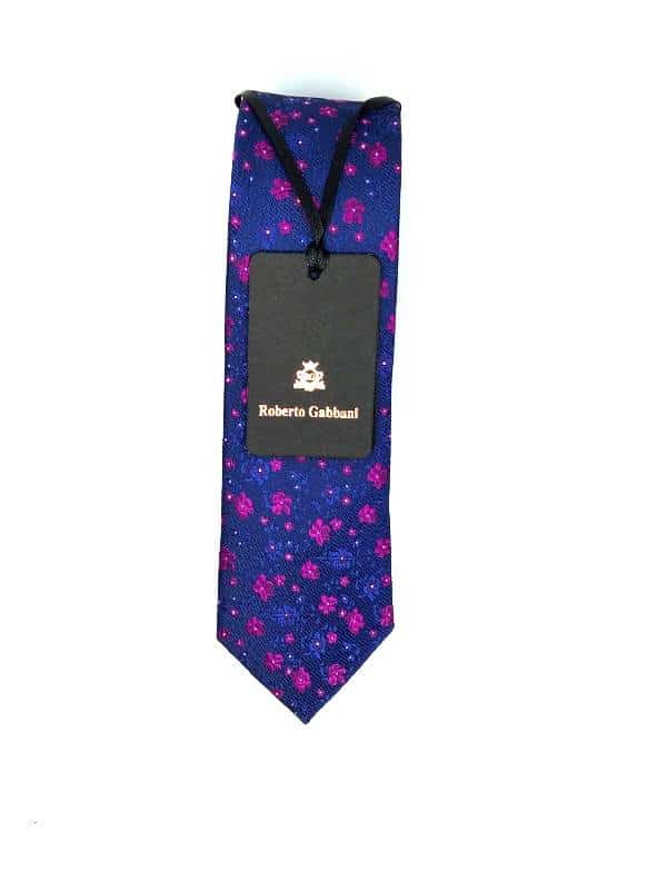 Elegancki krawat męski firmy Roberto Gabbani o klasycznym i modnym kroju, granatowy w różowe kwiatuszki. Wykonany ze sztucznego jedwabiu. Jest on bardzo ważnym elementem ubioru, dzięki któremu każdy mężczyzna może wnieść do swojego stroju odrobinę koloru. Kompletując garderobę należy pamiętać, aby krawat tworzył spójny zestaw z marynarką lub koszulą. Jego unikatowy wzór z pewnością spełni swoją funkcję w połączeniu z różnymi tkaninami w kilku wariantach kolorystycznych. Ponadto wyraźne i mocne akcenty zdobnicze dodadzą charakteru i pozwolą wyróżnić się stylem. Krawat można dobrać zarówno do karnacji, garnituru jak i temperamentu.