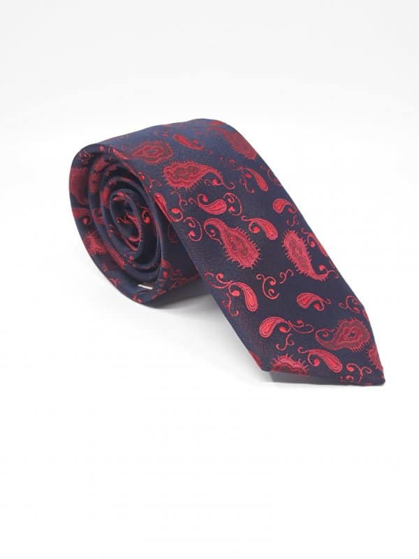 Elegancki krawat męski firmy Piotr o klasycznym i modnym kroju, koloru granatowego w ciekawy bordowy wzór.