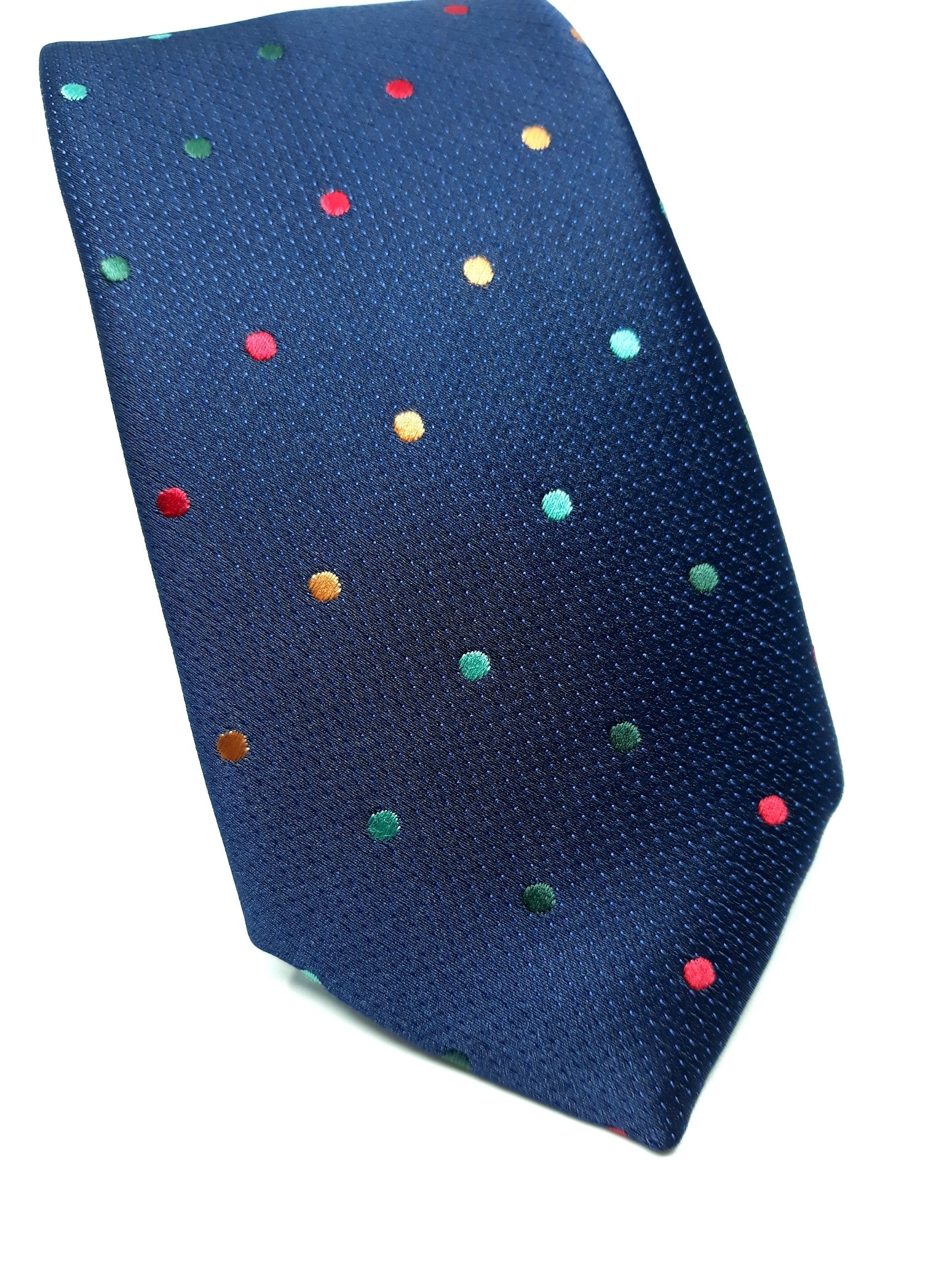 Elegancki krawat męski firmy Piotr o klasycznym i modnym kroju, granatowy w kolorowe kropki.Krawat o klasycznym i modnym kroju, wykonany ze sztucznego jedwabiu. Jest on bardzo ważnym elementem ubioru, dzięki któremu każdy mężczyzna może wnieść do swojego stroju odrobinę koloru. Kompletując garderobę należy pamiętać, aby krawat tworzył spójny zestaw z marynarką lub koszulą. Jego unikatowy wzór z pewnością spełni swoją funkcję w połączeniu z różnymi tkaninami w kilku wariantach kolorystycznych. Ponadto wyraźne i mocne akcenty zdobnicze dodadzą charakteru i pozwolą wyróżnić się stylem. Krawat można dobrać zarówno do karnacji, garnituru jak i temperamentu.