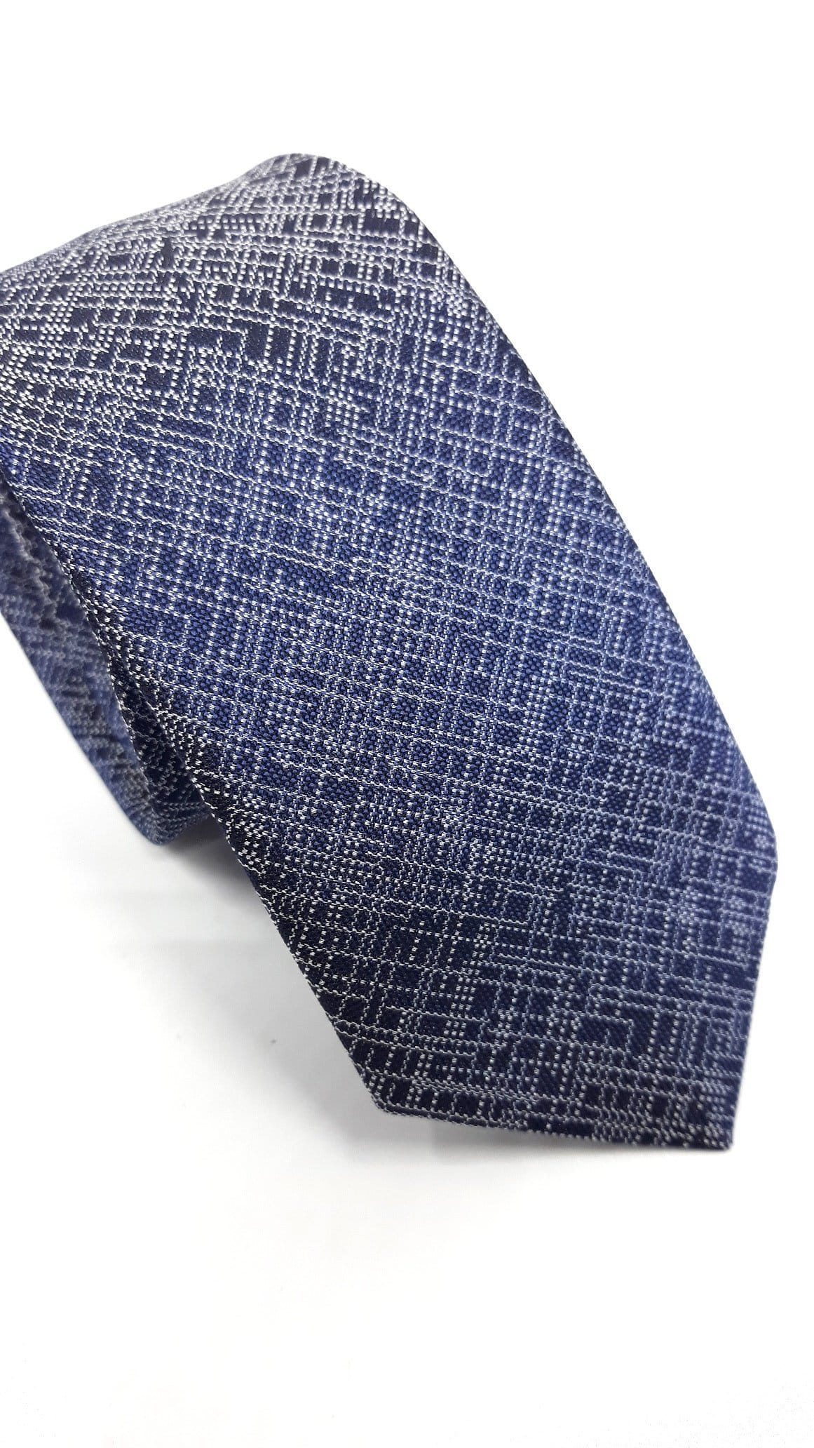 Elegancki krawat męski firmy Piotr o klasycznym i modnym kroju, granatowy we wzór mozaiki.Krawat o klasycznym i modnym kroju, wykonany ze sztucznego jedwabiu. Jest on bardzo ważnym elementem ubioru, dzięki któremu każdy mężczyzna może wnieść do swojego stroju odrobinę koloru. Kompletując garderobę należy pamiętać, aby krawat tworzył spójny zestaw z marynarką lub koszulą. Jego unikatowy wzór z pewnością spełni swoją funkcję w połączeniu z różnymi tkaninami w kilku wariantach kolorystycznych. Ponadto wyraźne i mocne akcenty zdobnicze dodadzą charakteru i pozwolą wyróżnić się stylem. Krawat można dobrać zarówno do karnacji, garnituru jak i temperamentu.