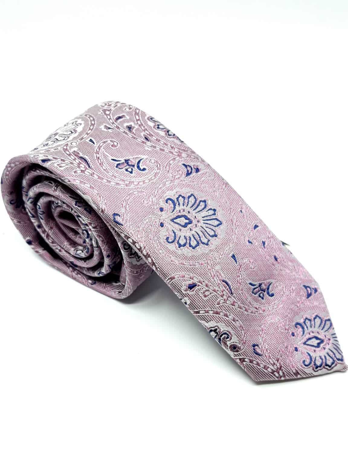 Elegancki krawat męski firmy Alties o klasycznym i modnym kroju w kolorze bladego różu w granatowy wzór. Krawat o klasycznym i modnym kroju, wykonany z microfibry. Jest on bardzo ważnym elementem ubioru, dzięki któremu każdy mężczyzna może wnieść do swojego stroju odrobinę koloru. Kompletując garderobę należy pamiętać, aby krawat tworzył spójny zestaw z marynarką lub koszulą. Jego unikatowy wzór z pewnością spełni swoją funkcję w połączeniu z różnymi tkaninami w kilku wariantach kolorystycznych. Ponadto wyraźne i mocne akcenty zdobnicze dodadzą charakteru i pozwolą wyróżnić się stylem. Krawat można dobrać zarówno do karnacji, garnituru jak i temperamentu.