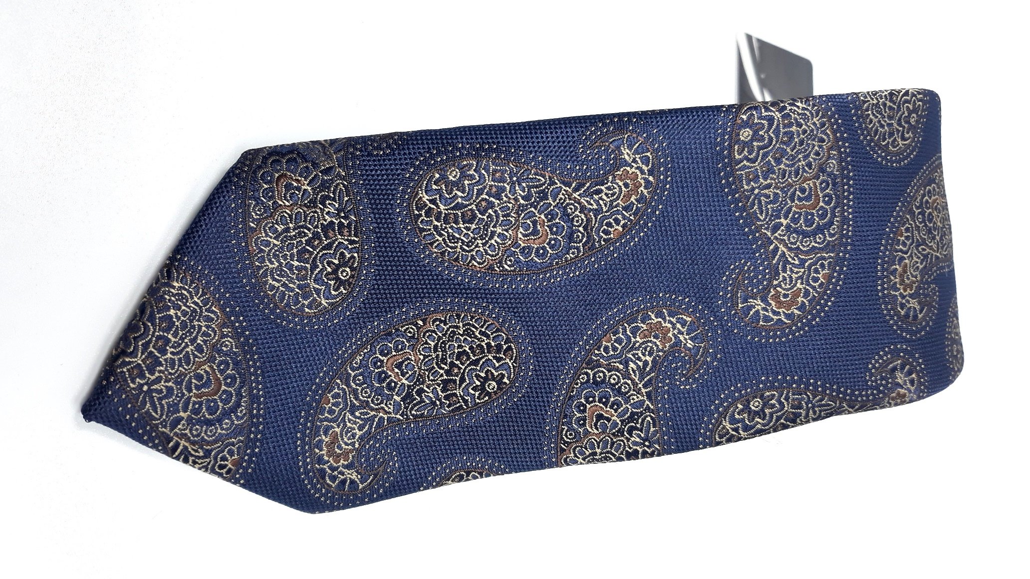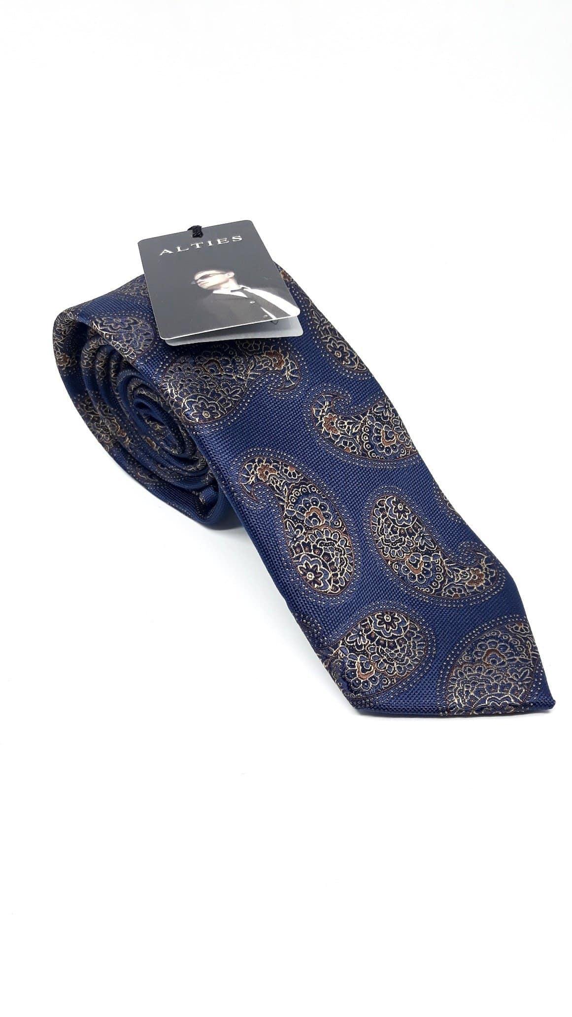 Elegancki krawat męski firmy Alties o klasycznym i modnym kroju, granatowy w złoty wzór. Krawat o klasycznym i modnym kroju, wykonany ze sztucznego jedwabiu. Jest on bardzo ważnym elementem ubioru, dzięki któremu każdy mężczyzna może wnieść do swojego stroju odrobinę koloru. Kompletując garderobę należy pamiętać, aby krawat tworzył spójny zestaw z marynarką lub koszulą. Jego unikatowy wzór z pewnością spełni swoją funkcję w połączeniu z różnymi tkaninami w kilku wariantach kolorystycznych. Ponadto wyraźne i mocne akcenty zdobnicze dodadzą charakteru i pozwolą wyróżnić się stylem. Krawat można dobrać zarówno do karnacji, garnituru jak i temperamentu.