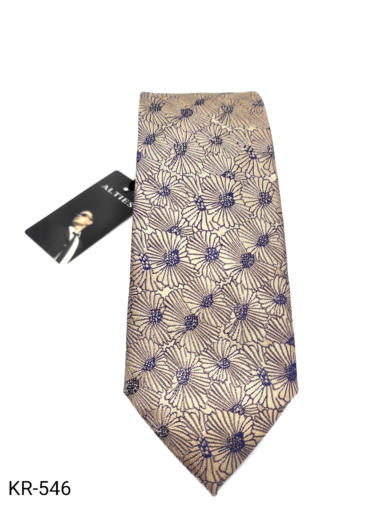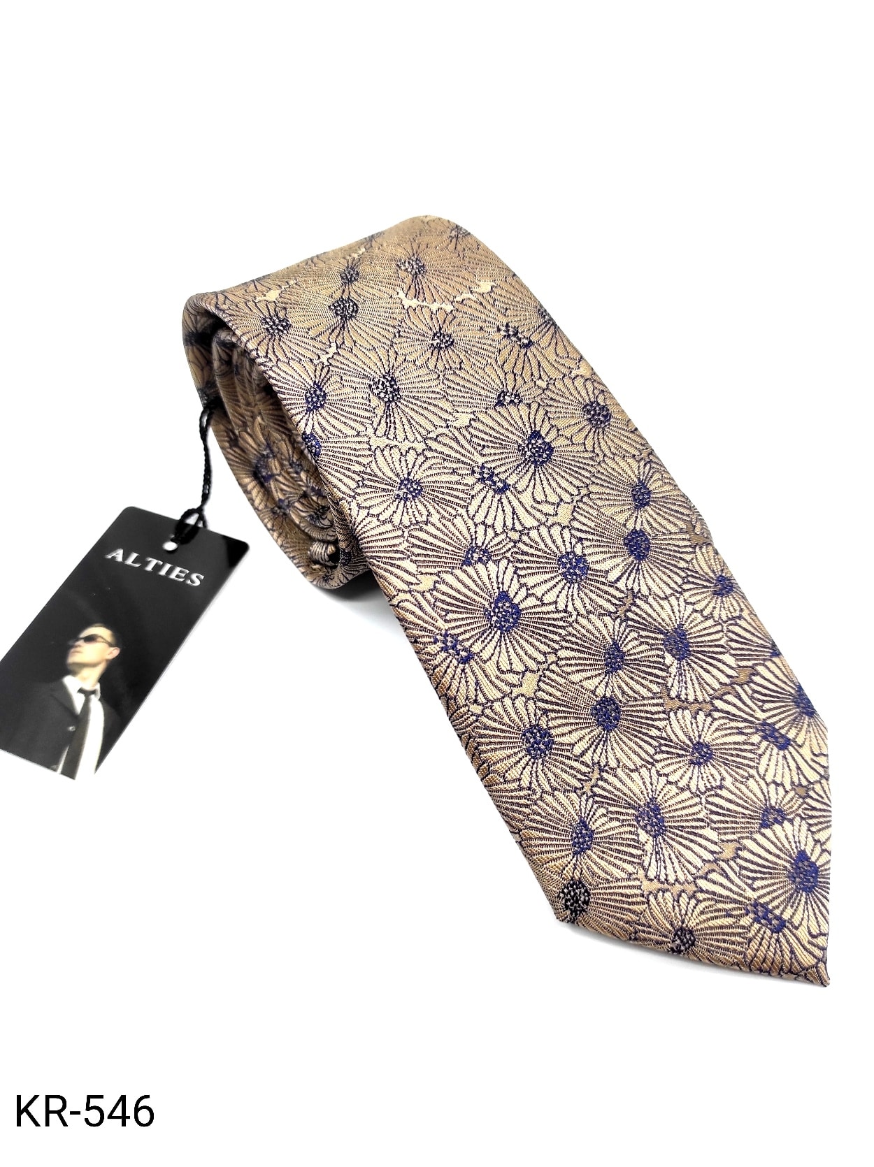 Elegancki krawat męski firmy Alties o klasycznym i modnym kroju,jasny brąz w granatowe kwiaty. Krawat o klasycznym i modnym kroju, wykonany z microfibry. Jest on bardzo ważnym elementem ubioru, dzięki któremu każdy mężczyzna może wnieść do swojego stroju odrobinę koloru. Kompletując garderobę należy pamiętać, aby krawat tworzył spójny zestaw z marynarką lub koszulą. Jego unikatowy wzór z pewnością spełni swoją funkcję w połączeniu z różnymi tkaninami w kilku wariantach kolorystycznych. Ponadto wyraźne i mocne akcenty zdobnicze dodadzą charakteru i pozwolą wyróżnić się stylem. Krawat można dobrać zarówno do karnacji, garnituru jak i temperamentu.