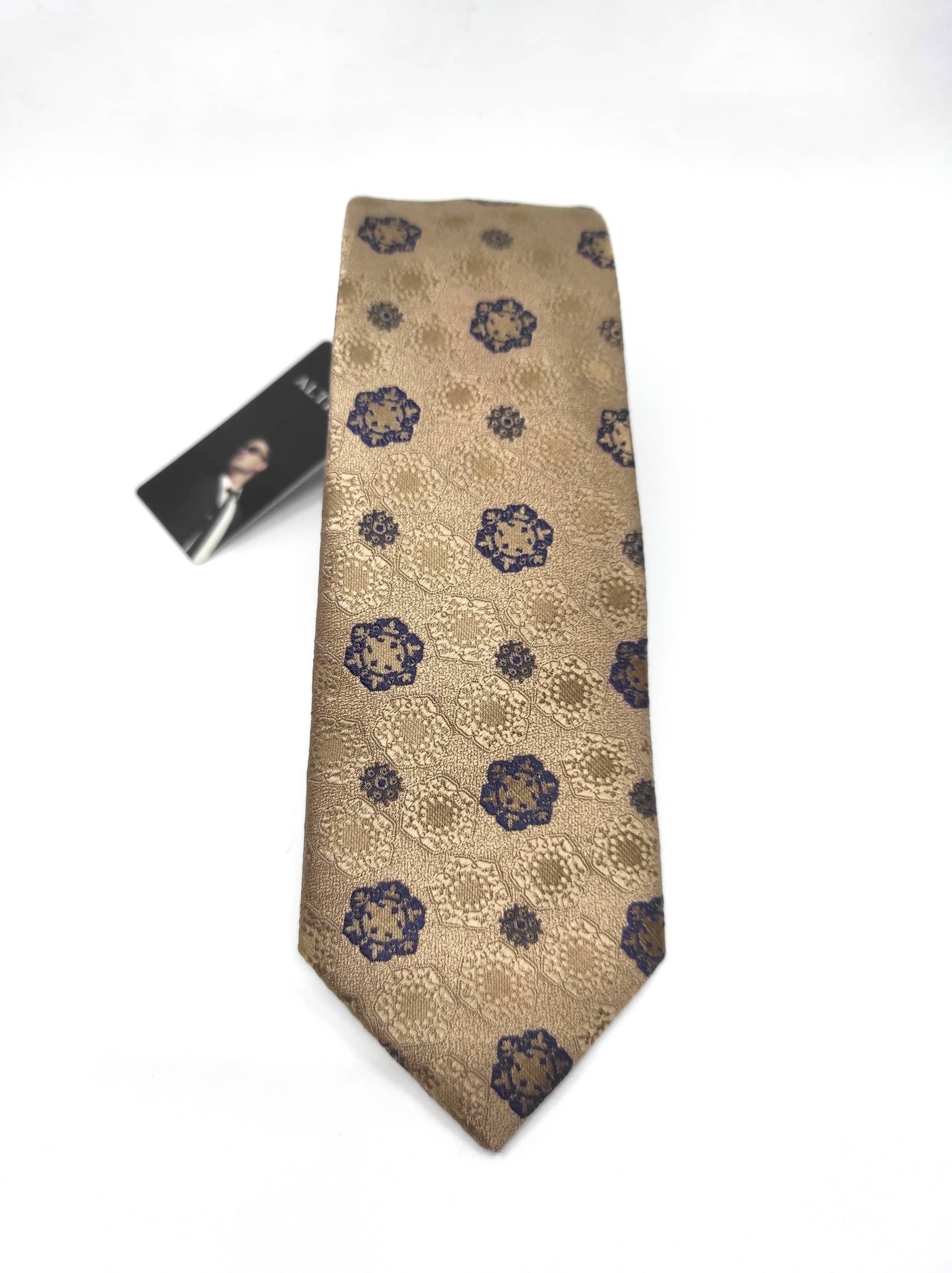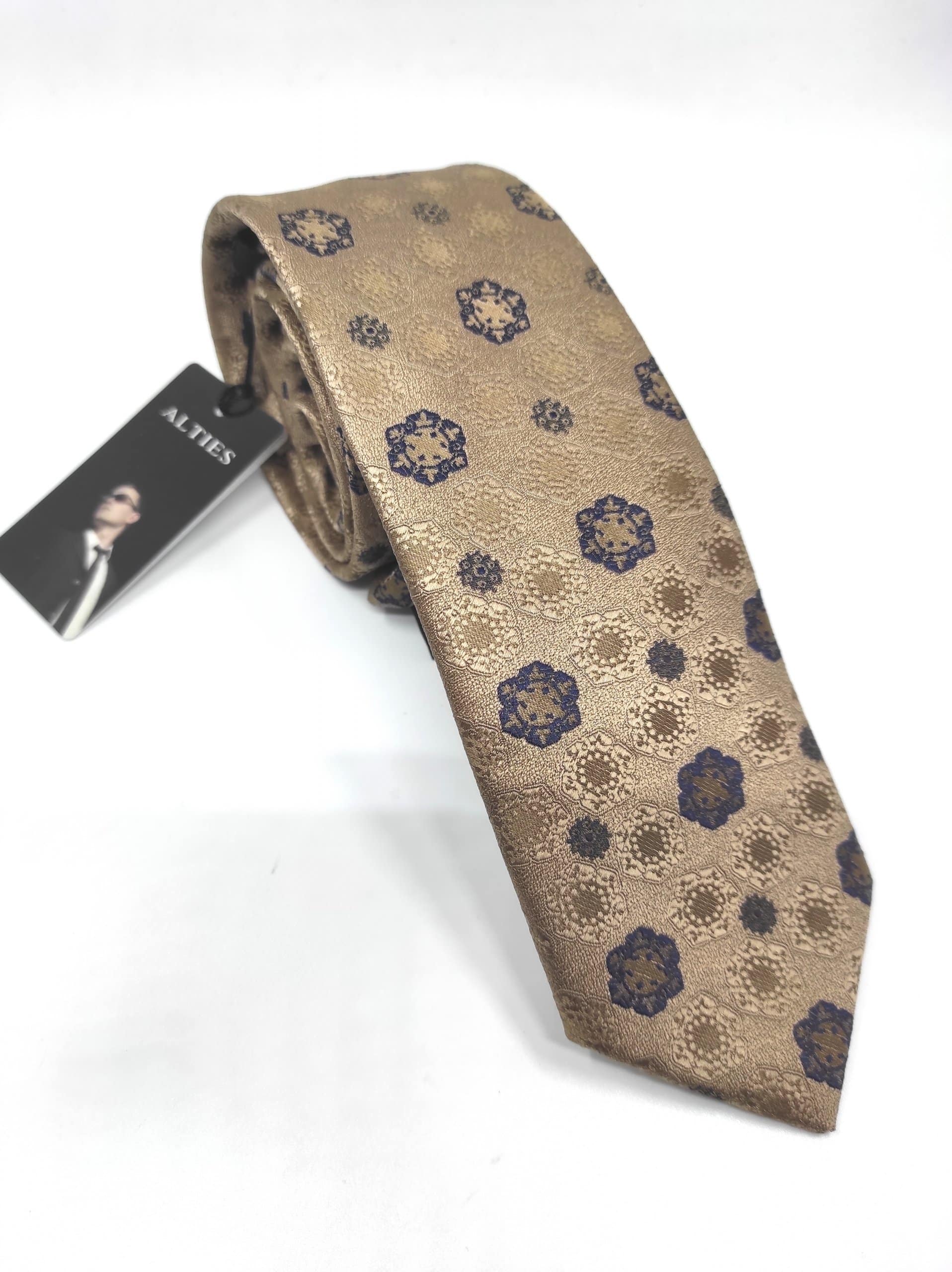 Elegancki krawat męski firmy Alties o klasycznym i modnym kroju,jasny brąz / kawa z mlekiem w granatowy wzorek. Krawat o klasycznym i modnym kroju, wykonany z microfibry. Jest on bardzo ważnym elementem ubioru, dzięki któremu każdy mężczyzna może wnieść do swojego stroju odrobinę koloru. Kompletując garderobę należy pamiętać, aby krawat tworzył spójny zestaw z marynarką lub koszulą. Jego unikatowy wzór z pewnością spełni swoją funkcję w połączeniu z różnymi tkaninami w kilku wariantach kolorystycznych. Ponadto wyraźne i mocne akcenty zdobnicze dodadzą charakteru i pozwolą wyróżnić się stylem. Krawat można dobrać zarówno do karnacji, garnituru jak i temperamentu.
