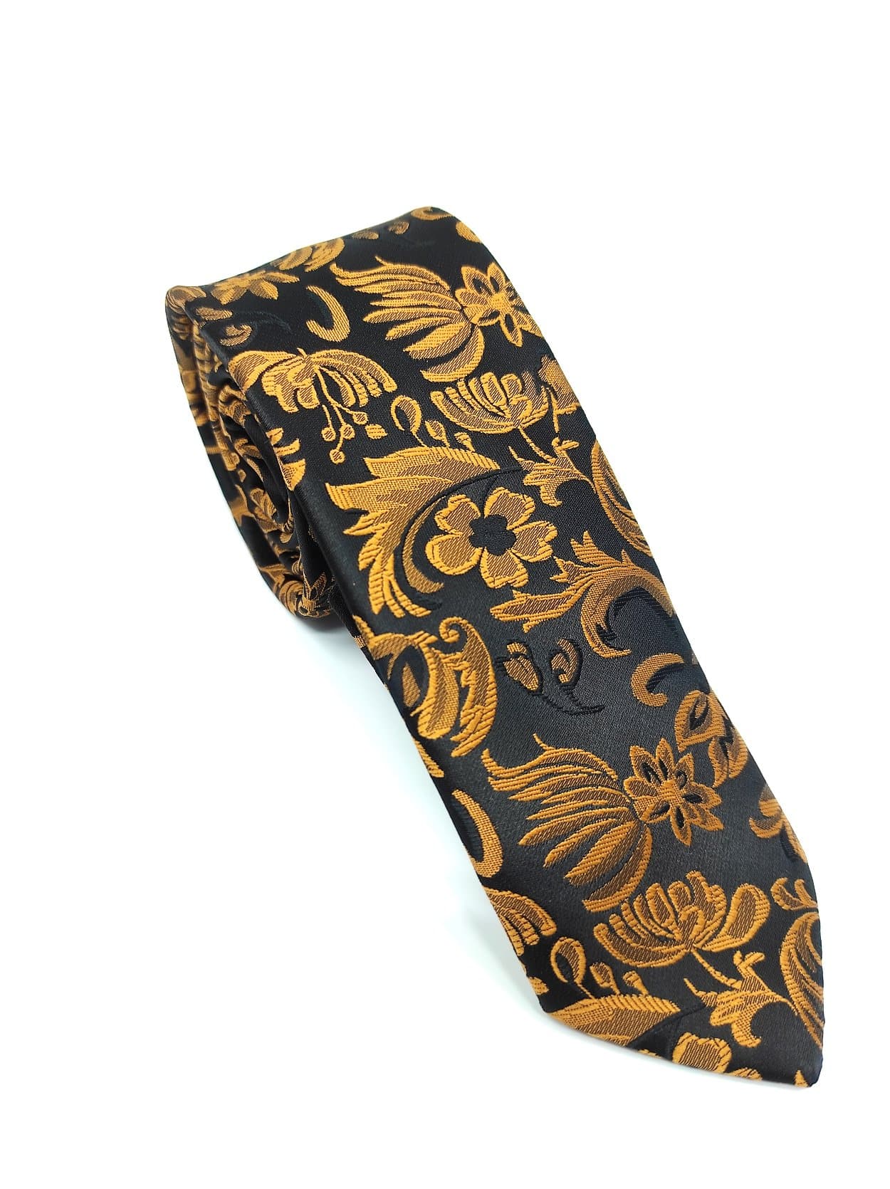 Elegancki krawat męski firmy Piotr czarny w miedziane kwiaty o klasycznym i modnym kroju.Krawat o klasycznym i modnym kroju, wykonany ze sztucznego jedwabiu. Jest on bardzo ważnym elementem ubioru, dzięki któremu każdy mężczyzna może wnieść do swojego stroju odrobinę koloru. Kompletując garderobę należy pamiętać, aby krawat tworzył spójny zestaw z marynarką lub koszulą. Jego unikatowy wzór z pewnością spełni swoją funkcję w połączeniu z różnymi tkaninami w kilku wariantach kolorystycznych. Ponadto wyraźne i mocne akcenty zdobnicze dodadzą charakteru i pozwolą wyróżnić się stylem. Krawat można dobrać zarówno do karnacji, garnituru jak i temperamentu.