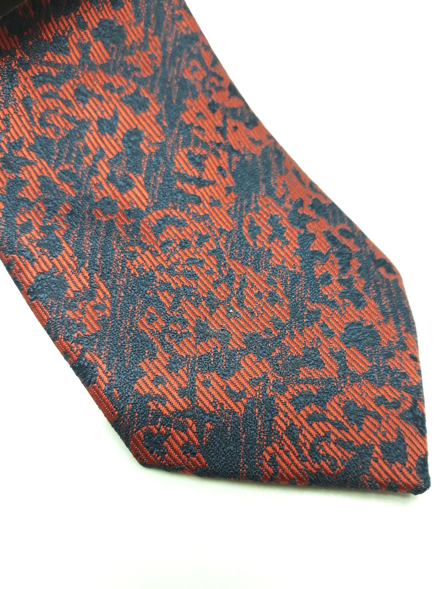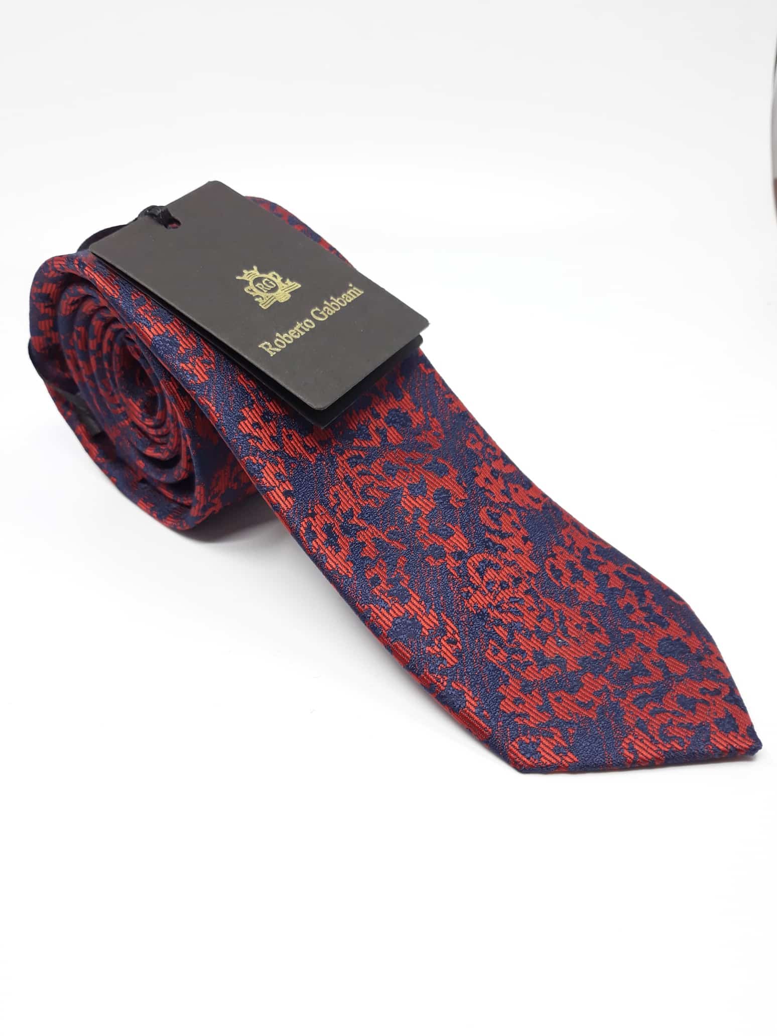 Elegancki krawat męski firmy Roberto Gabbani o klasycznym i modnym kroju, miedziany w granatowy wzór.