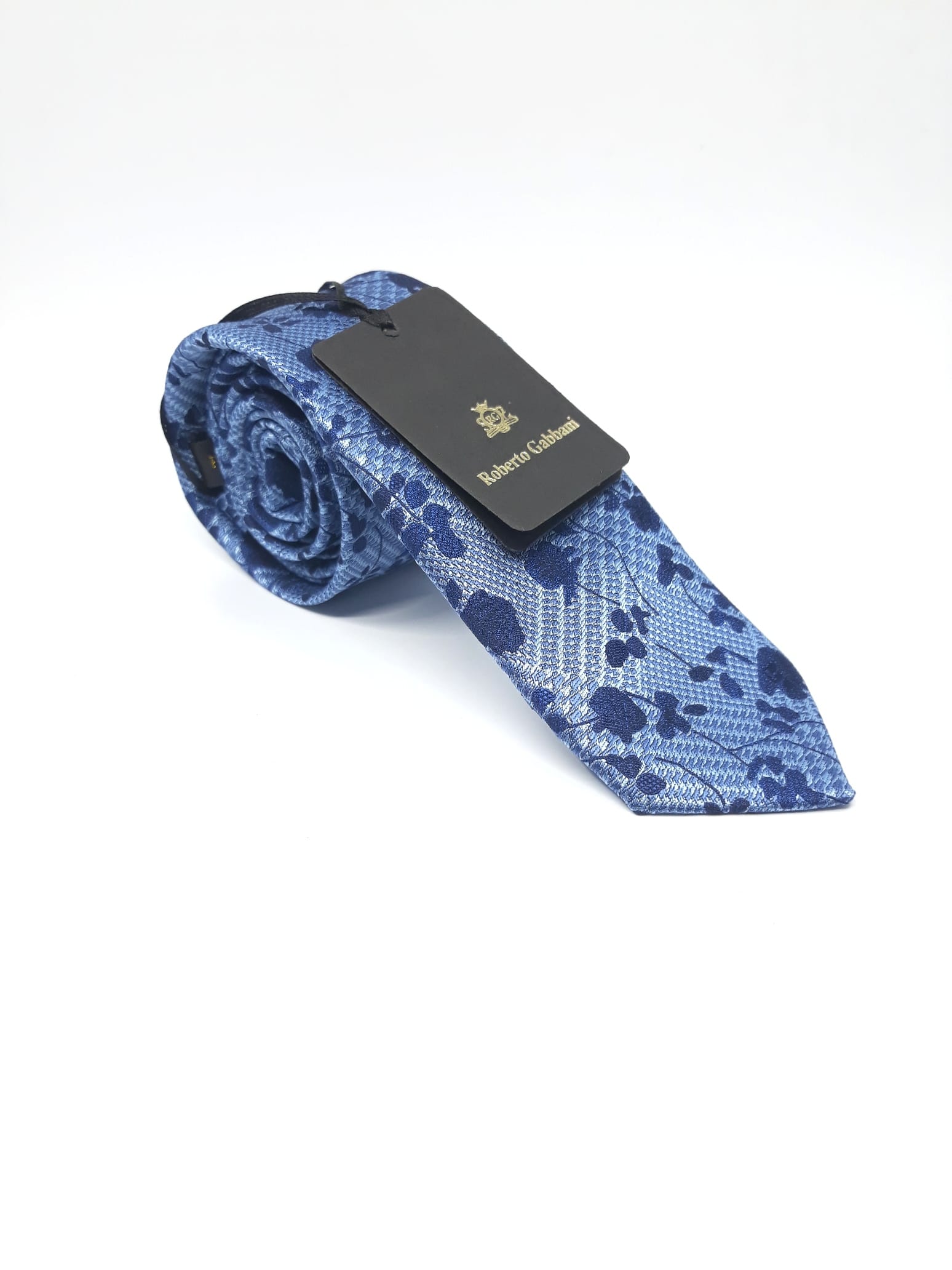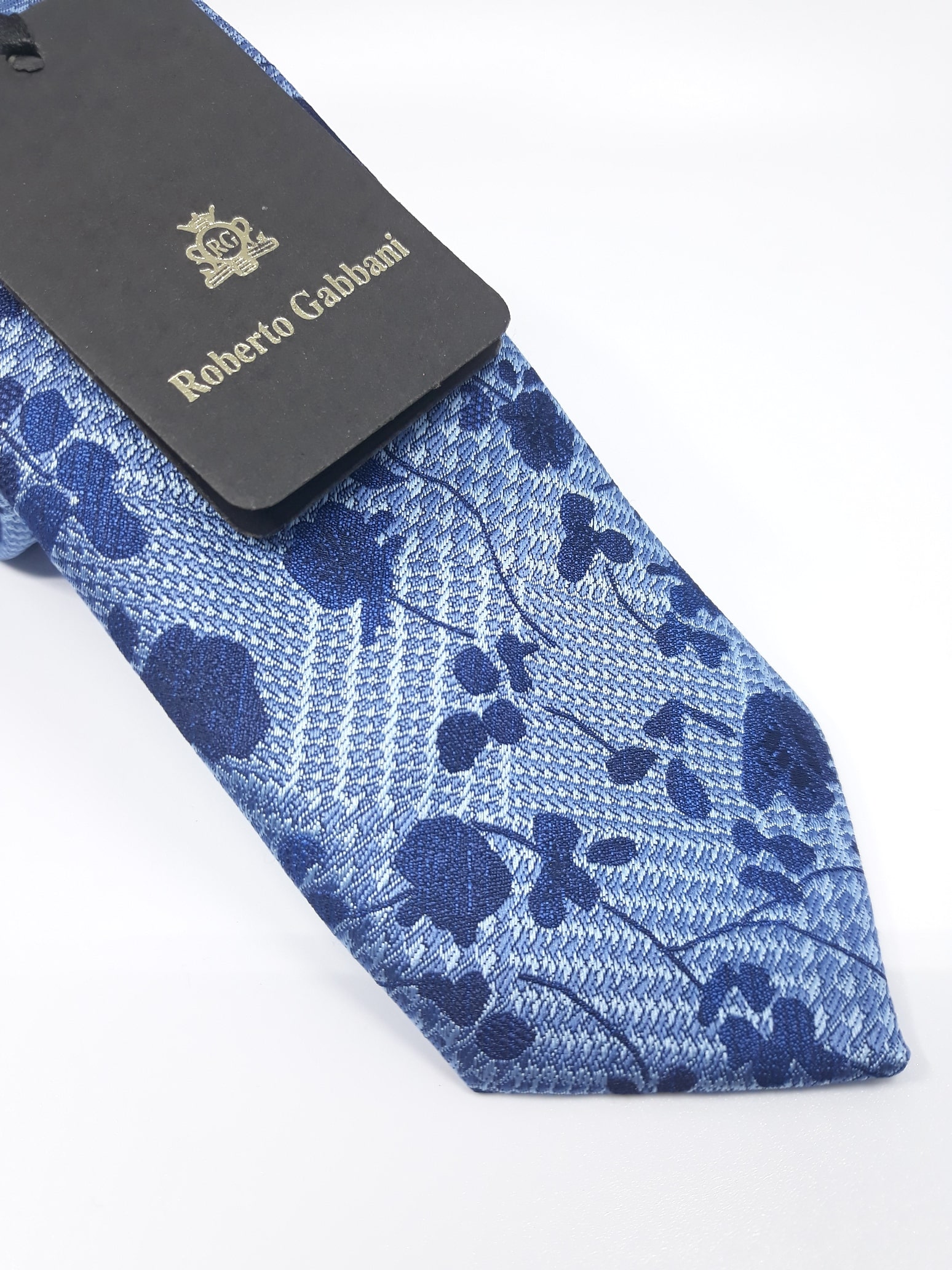 Elegancki krawat męski firmy Roberto-Gabbani o klasycznym i modnym kroju, niebieski posiadający granatowy wzór.