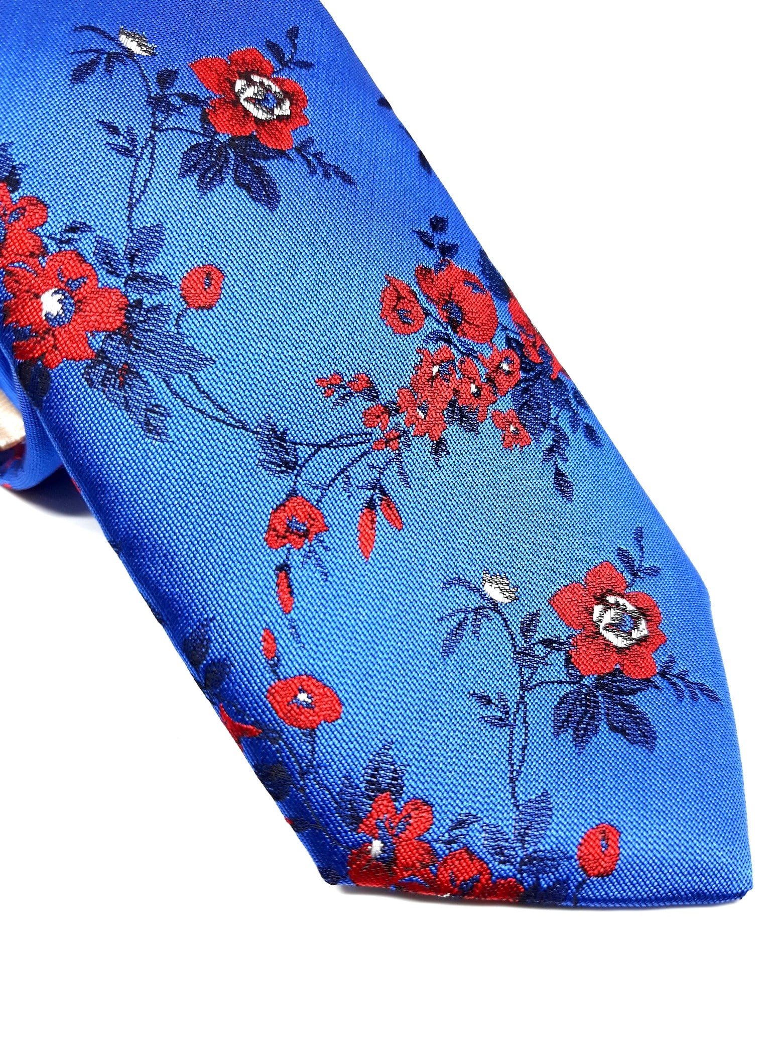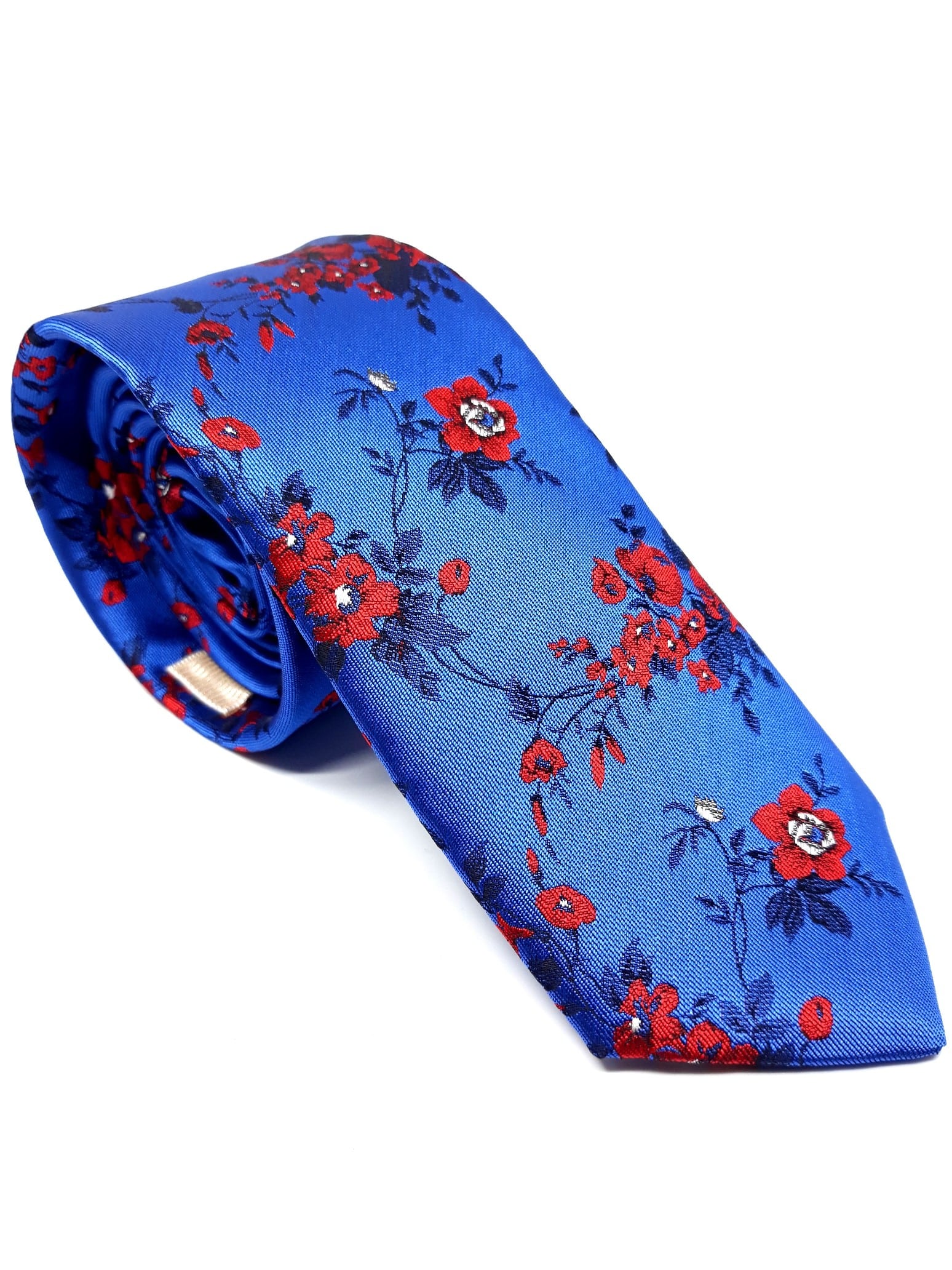 Elegancki krawat męski firmy Piotr o klasycznym i modnym kroju, niebieski w czerwone maki.