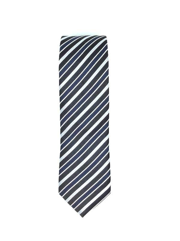 Elegancki krawat męski firmy Piotr w paski w odcieniach granat i niebieski.Krawat o klasycznym i modnym kroju, wykonany ze sztucznego jedwabiu. Jest on bardzo ważnym elementem ubioru, dzięki któremu każdy mężczyzna może wnieść do swojego stroju odrobinę koloru. Kompletując garderobę należy pamiętać, aby krawat tworzył spójny zestaw z marynarką lub koszulą. Jego unikatowy wzór z pewnością spełni swoją funkcję w połączeniu z różnymi tkaninami w kilku wariantach kolorystycznych. Ponadto wyraźne i mocne akcenty zdobnicze dodadzą charakteru i pozwolą wyróżnić się stylem. Krawat można dobrać zarówno do karnacji, garnituru jak i temperamentu.