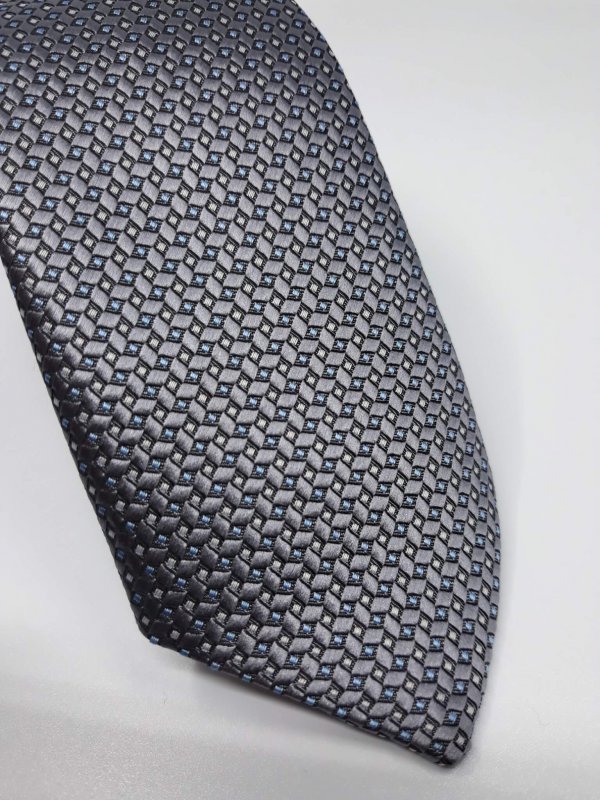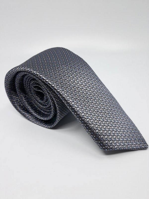 Elegancki krawat męski firmy Piotr o klasycznym i modnym kroju w kolorze popielatym w romby i kropkiKrawat o klasycznym i modnym kroju, wykonany ze sztucznego jedwabiu. Jest on bardzo ważnym elementem ubioru, dzięki któremu każdy mężczyzna może wnieść do swojego stroju odrobinę koloru. Kompletując garderobę należy pamiętać, aby krawat tworzył spójny zestaw z marynarką lub koszulą. Jego unikatowy wzór z pewnością spełni swoją funkcję w połączeniu z różnymi tkaninami w kilku wariantach kolorystycznych. Ponadto wyraźne i mocne akcenty zdobnicze dodadzą charakteru i pozwolą wyróżnić się stylem. Krawat można dobrać zarówno do karnacji, garnituru jak i temperamentu.