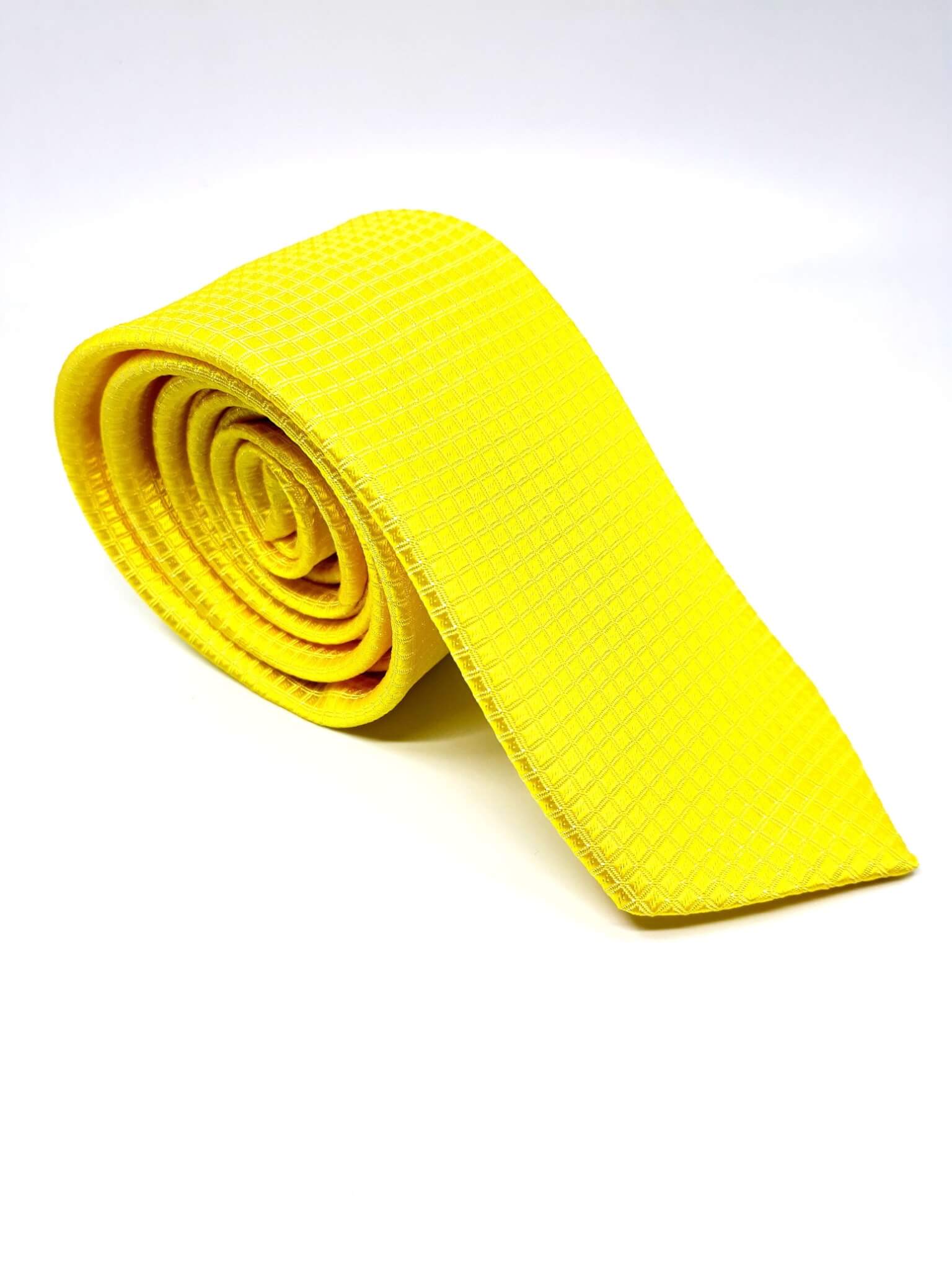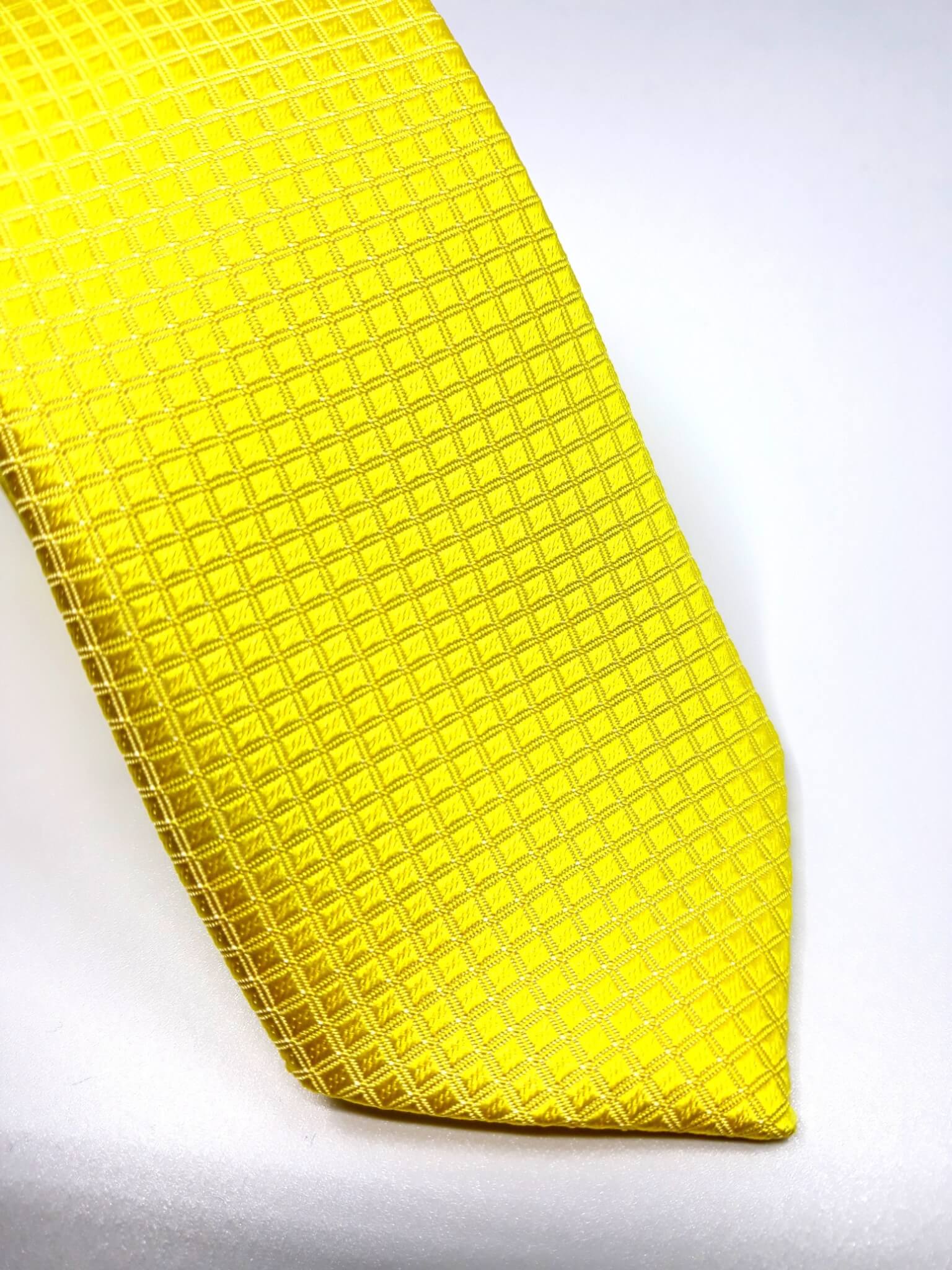 Elegancki krawat męski firmy Piotr o klasycznym i modnym kroju, koloru żółtego w tłoczoną kratkę.