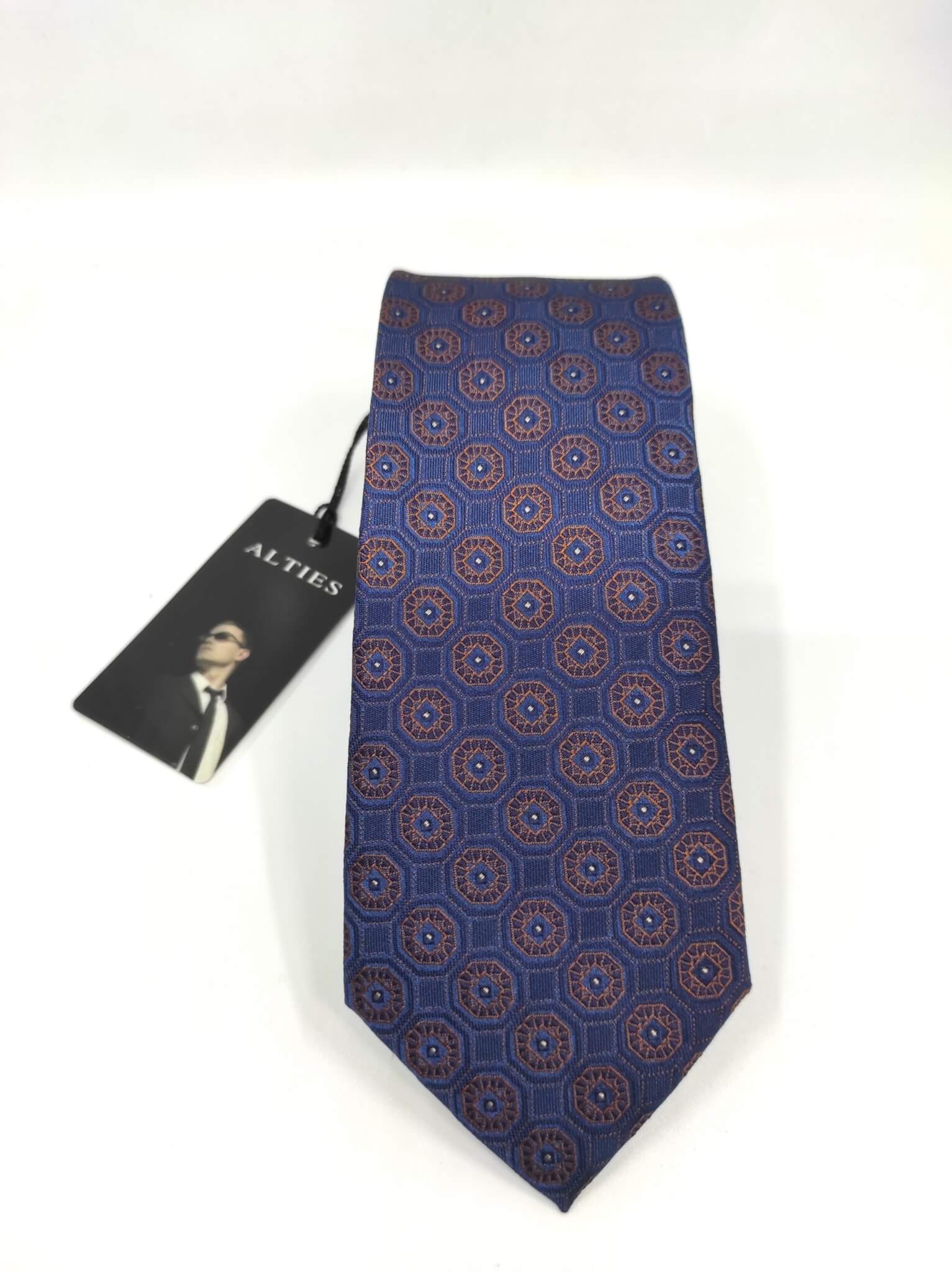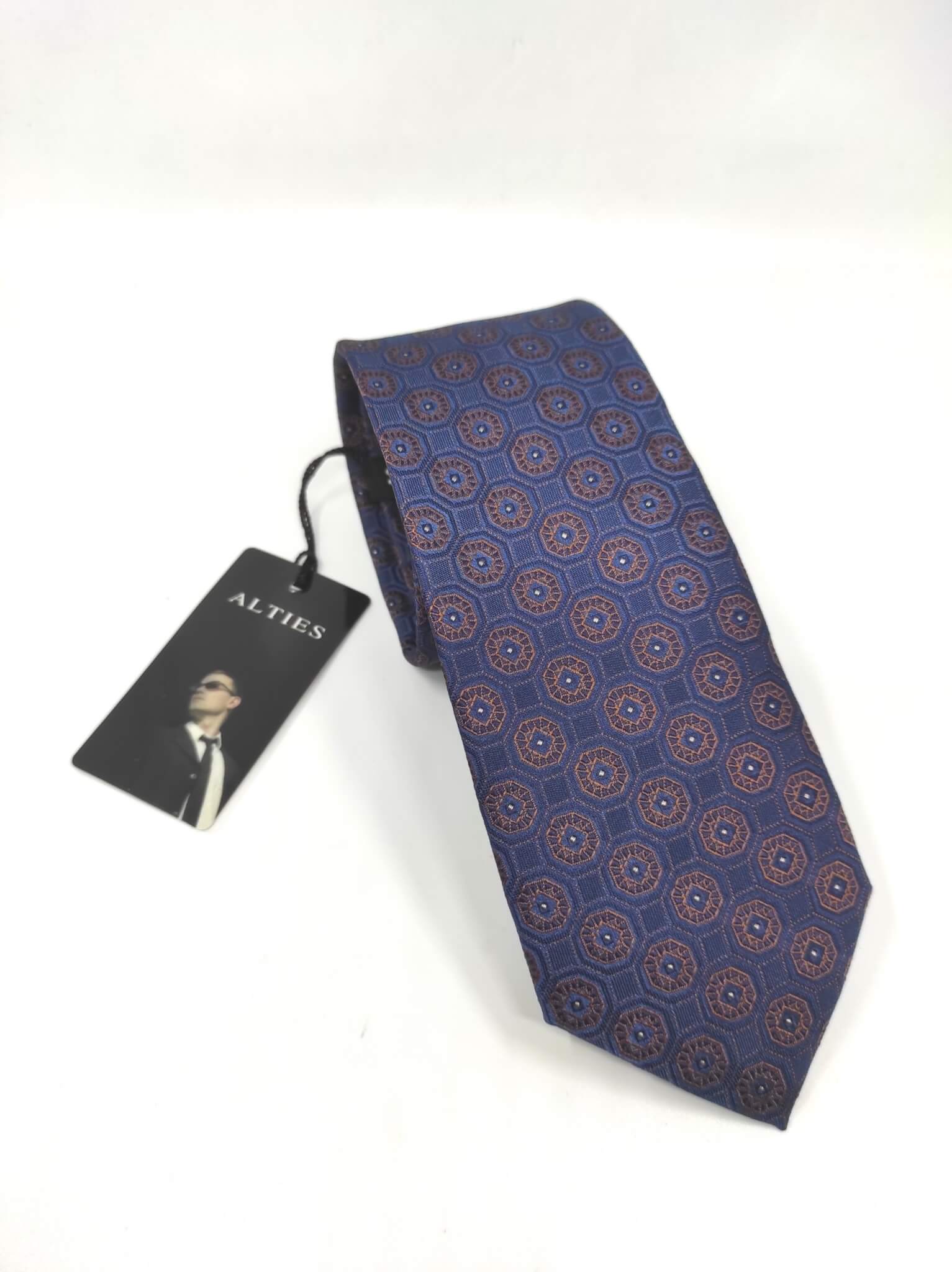 Elegancki krawat męski firmy Alties o klasycznym i modnym kroju,granatowy w brąz wzór. Krawat o klasycznym i modnym kroju, wykonany z microfibry. Jest on bardzo ważnym elementem ubioru, dzięki któremu każdy mężczyzna może wnieść do swojego stroju odrobinę koloru. Kompletując garderobę należy pamiętać, aby krawat tworzył spójny zestaw z marynarką lub koszulą. Jego unikatowy wzór z pewnością spełni swoją funkcję w połączeniu z różnymi tkaninami w kilku wariantach kolorystycznych. Ponadto wyraźne i mocne akcenty zdobnicze dodadzą charakteru i pozwolą wyróżnić się stylem. Krawat można dobrać zarówno do karnacji, garnituru jak i temperamentu.