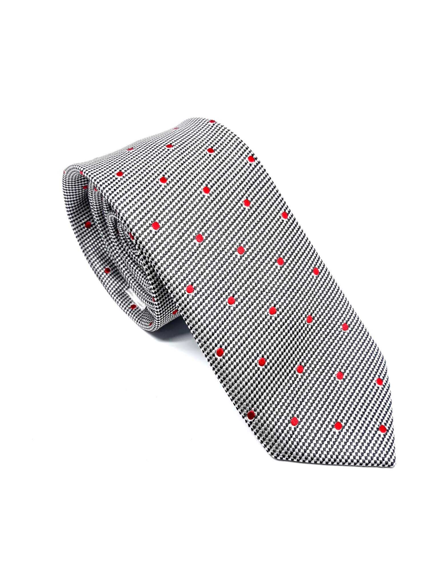 Elegancki krawat męski firmy Piotr o klasycznym i modnym kroju, popielaty w bordowe kropki.