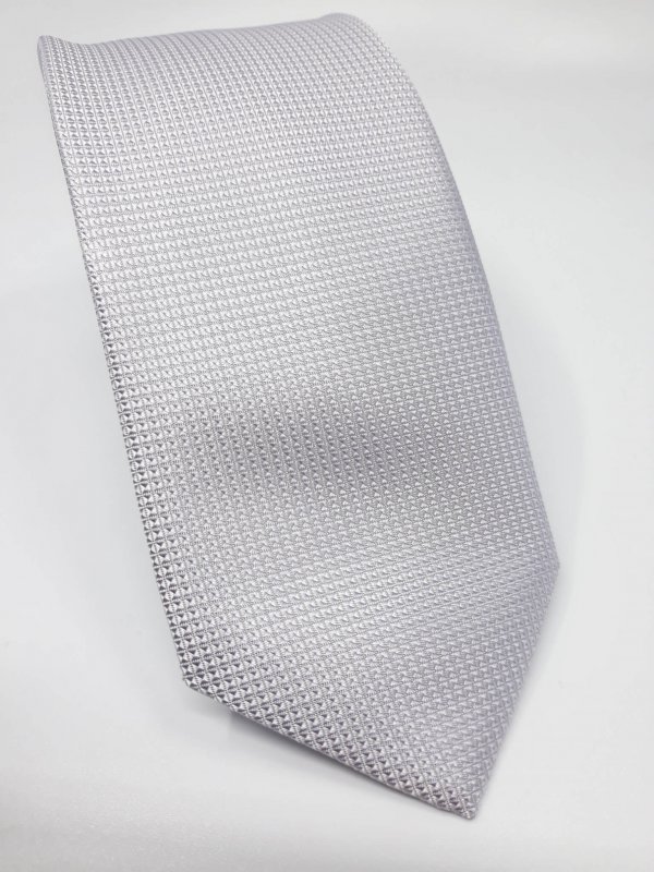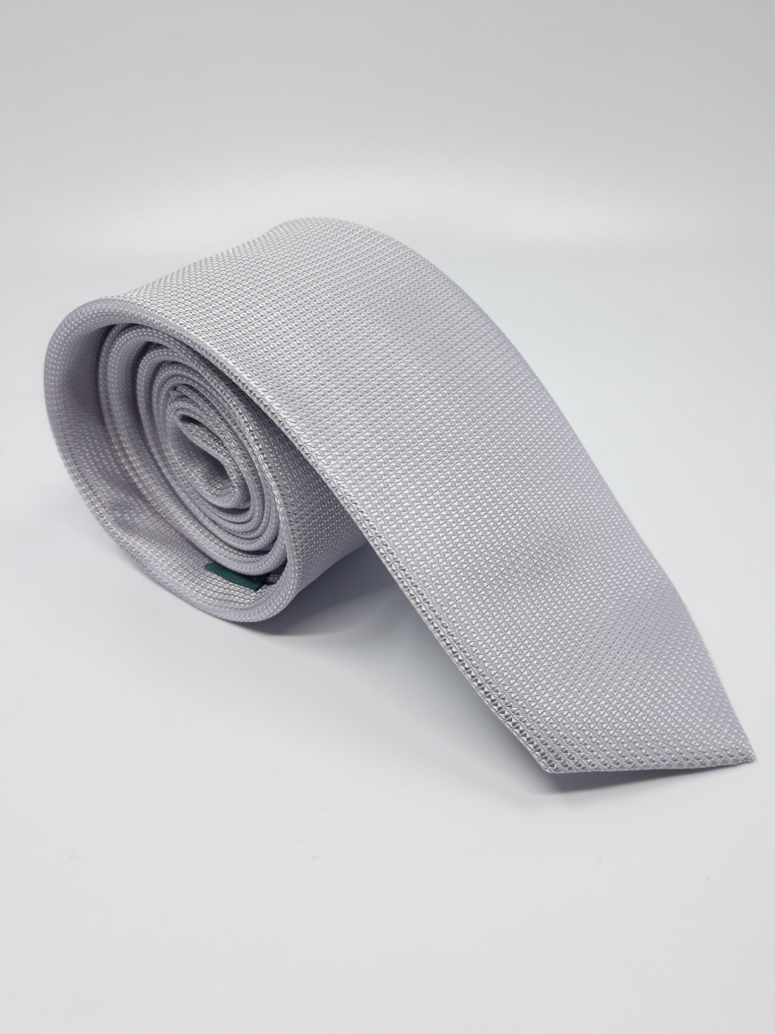 Elegancki krawat męski firmy Piotr o klasycznym i modnym kroju, popielaty w delikatnie tłoczony wzór.