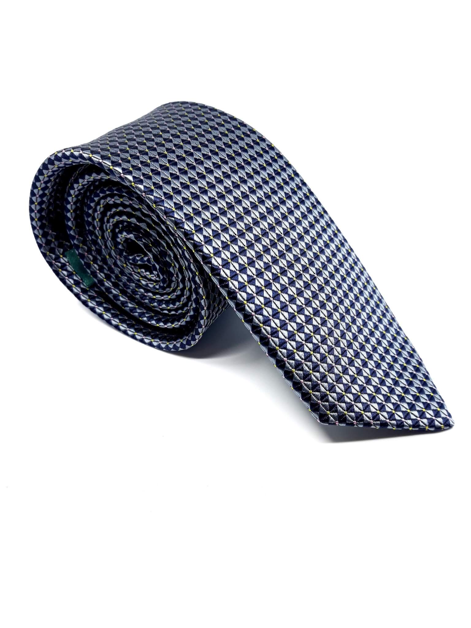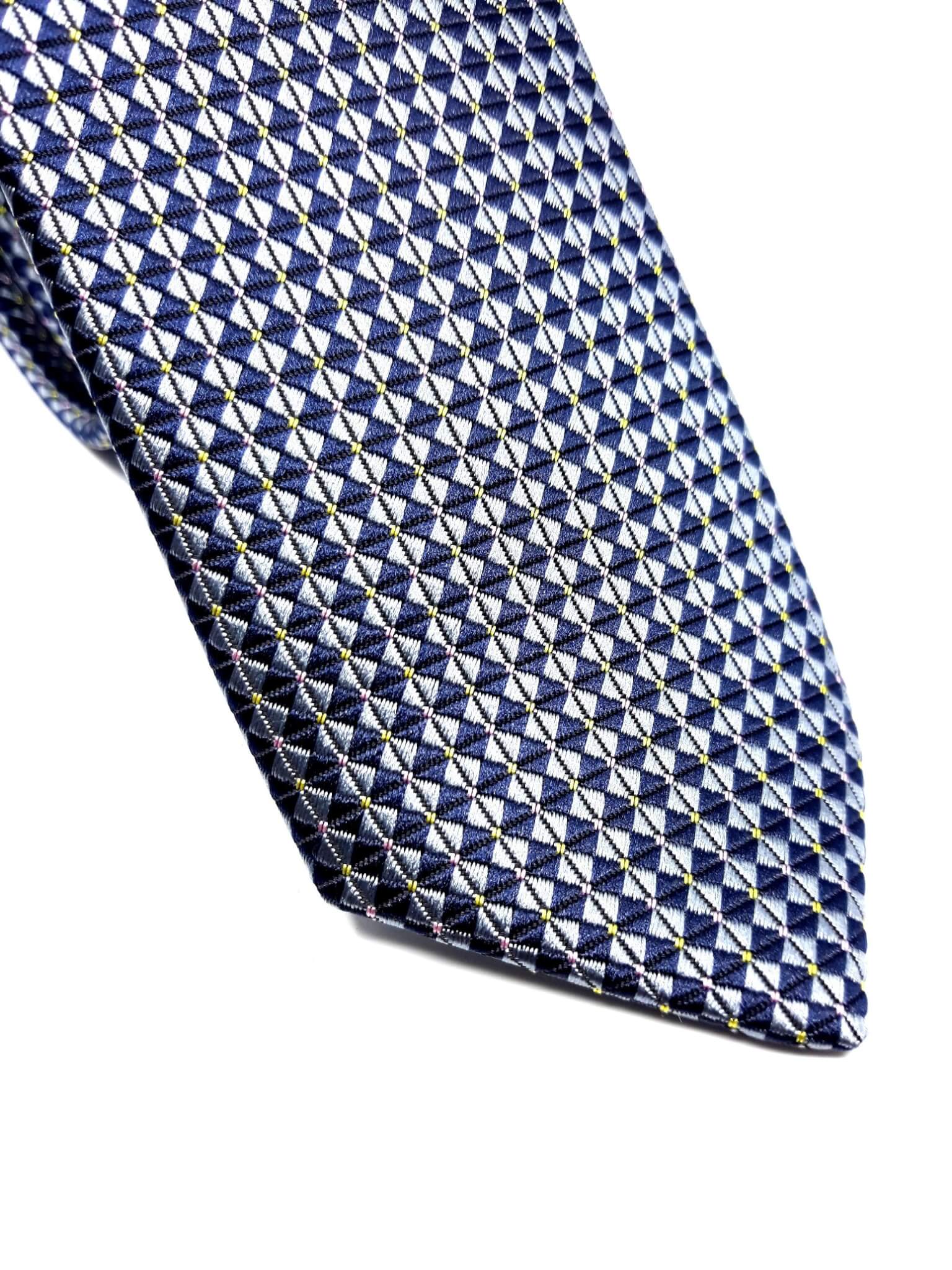 Elegancki krawat męski firmy Piotr o klasycznym i modnym kroju w kolorze granatowym w popielaty wzór.Krawat o klasycznym i modnym kroju, wykonany ze sztucznego jedwabiu. Jest on bardzo ważnym elementem ubioru, dzięki któremu każdy mężczyzna może wnieść do swojego stroju odrobinę koloru. Kompletując garderobę należy pamiętać, aby krawat tworzył spójny zestaw z marynarką lub koszulą. Jego unikatowy wzór z pewnością spełni swoją funkcję w połączeniu z różnymi tkaninami w kilku wariantach kolorystycznych. Ponadto wyraźne i mocne akcenty zdobnicze dodadzą charakteru i pozwolą wyróżnić się stylem. Krawat można dobrać zarówno do karnacji, garnituru jak i temperamentu.