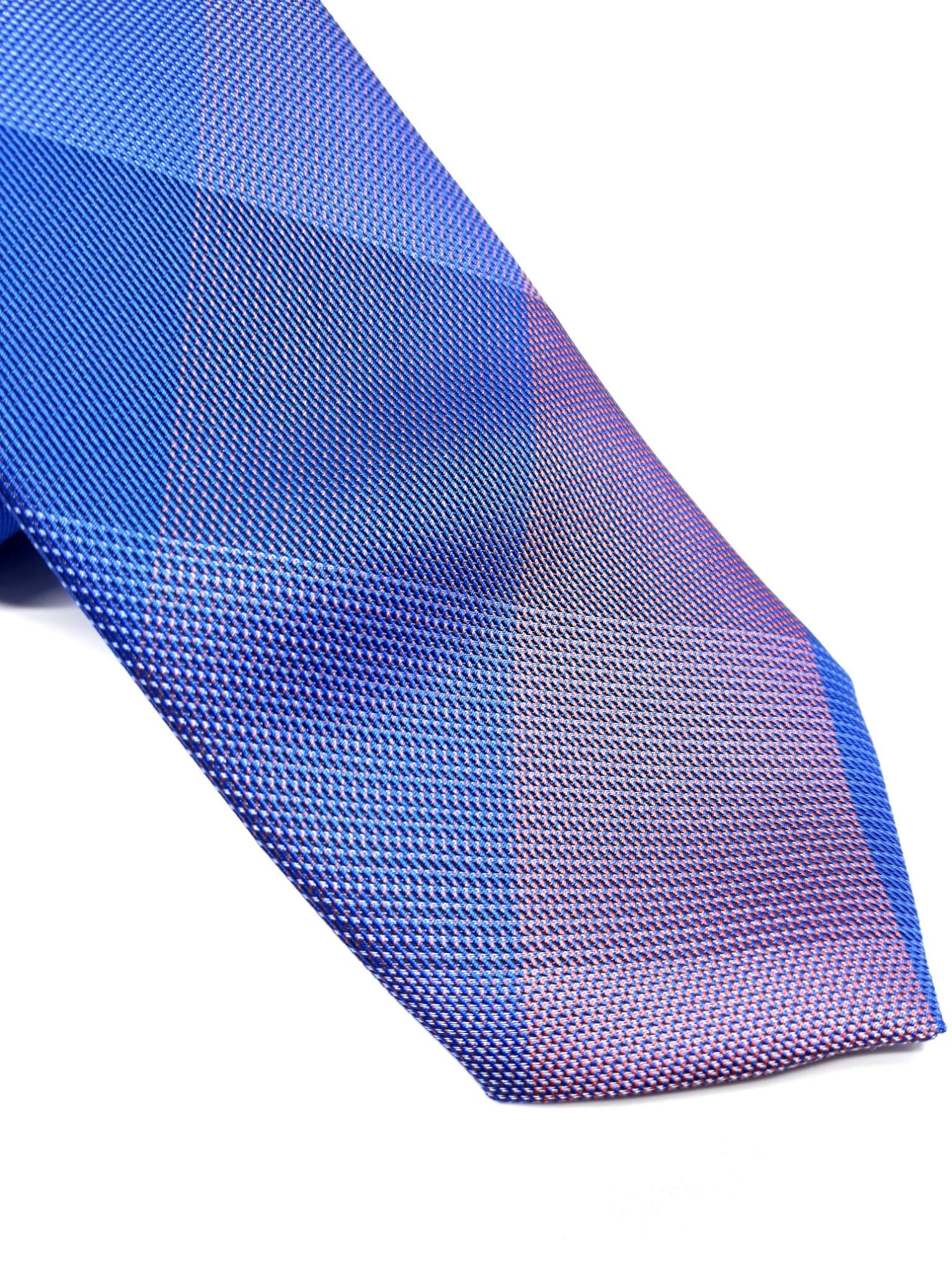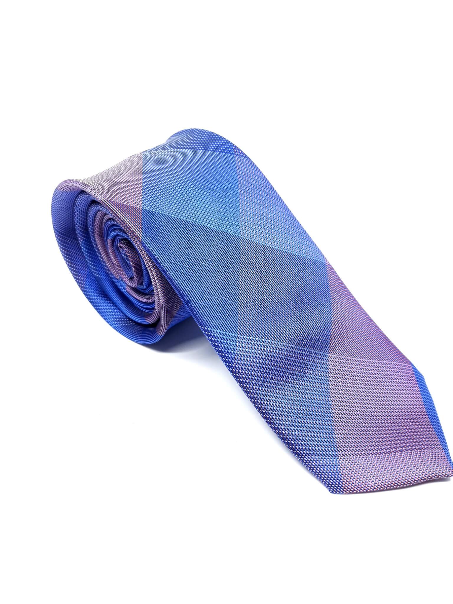 Elegancki krawat męski firmy Piotr o klasycznym i modnym kroju, różowo niebieski w kratę.