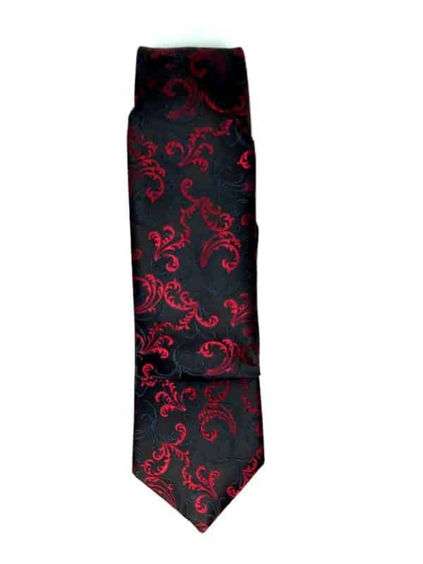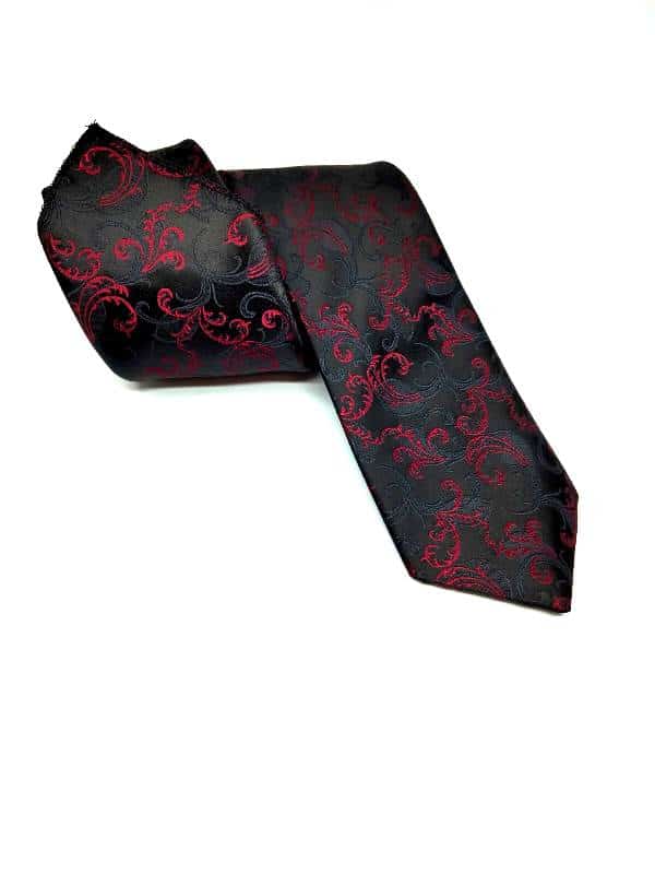 Elegancki krawat ślubny firmy Gabriel wraz z poszetką o klasycznym i modnym kroju, czarny w czerwony wzór. Wykonany ze sztucznego jedwabiu. Jest on bardzo ważnym elementem ubioru, dzięki któremu każdy mężczyzna może wnieść do swojego stroju odrobinę koloru. Kompletując garderobę należy pamiętać, aby krawat tworzył spójny zestaw z marynarką lub koszulą. Jego unikatowy wzór z pewnością spełni swoją funkcję w połączeniu z różnymi tkaninami w kilku wariantach kolorystycznych. Ponadto wyraźne i mocne akcenty zdobnicze dodadzą charakteru i pozwolą wyróżnić się stylem. Krawat można dobrać zarówno do karnacji, garnituru jak i temperamentu.