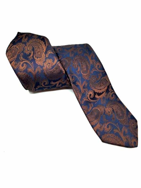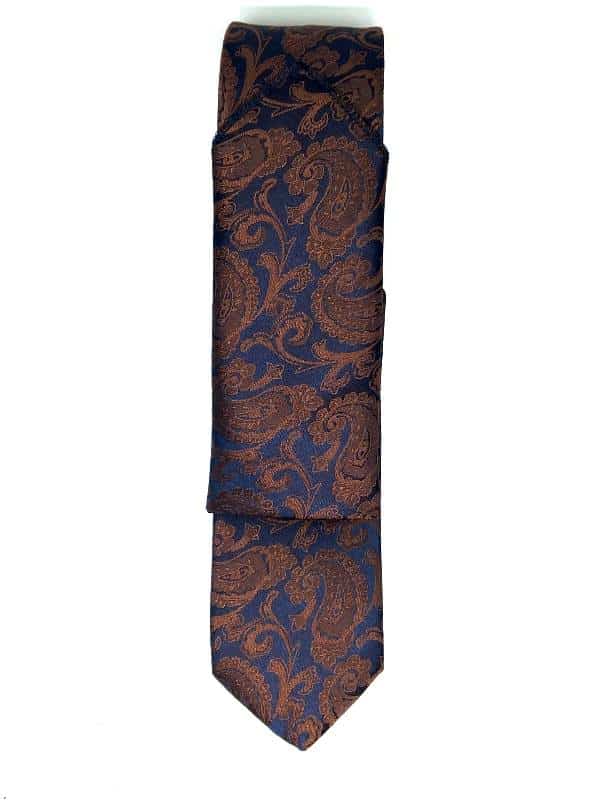 Elegancki krawat ślubny firmy Gabriel wraz z poszetką o klasycznym i modnym kroju, granatowy w brązowy wzór. Wykonany ze sztucznego jedwabiu. Jest on bardzo ważnym elementem ubioru, dzięki któremu każdy mężczyzna może wnieść do swojego stroju odrobinę koloru. Kompletując garderobę należy pamiętać, aby krawat tworzył spójny zestaw z marynarką lub koszulą. Jego unikatowy wzór z pewnością spełni swoją funkcję w połączeniu z różnymi tkaninami w kilku wariantach kolorystycznych. Ponadto wyraźne i mocne akcenty zdobnicze dodadzą charakteru i pozwolą wyróżnić się stylem. Krawat można dobrać zarówno do karnacji, garnituru jak i temperamentu.