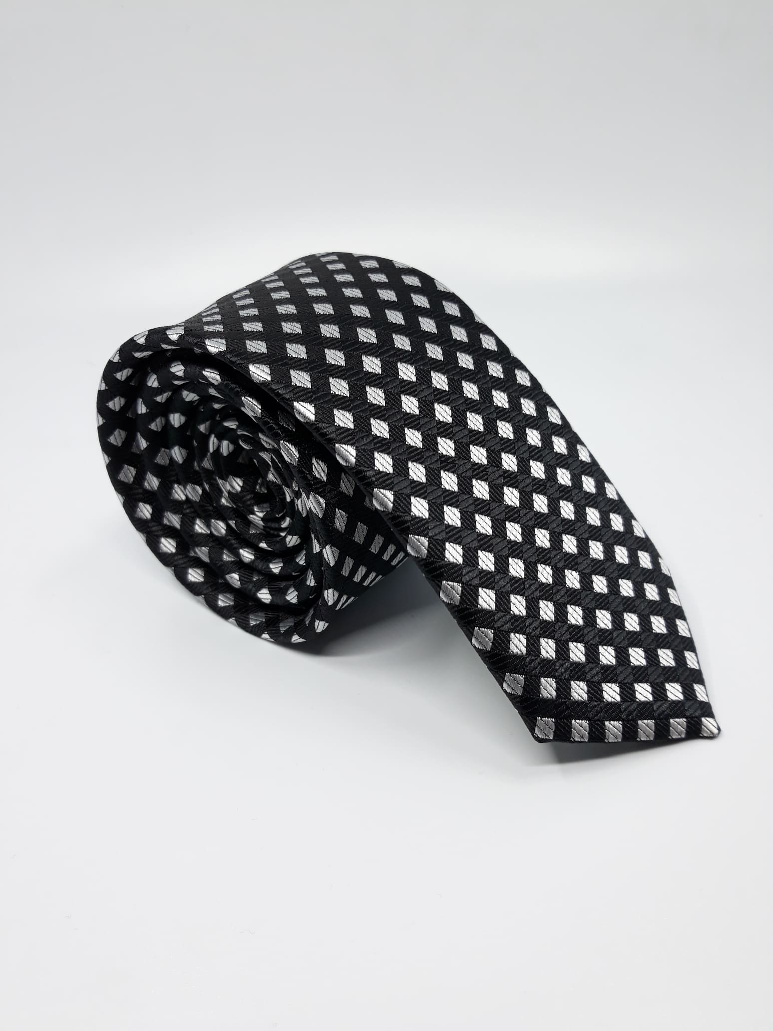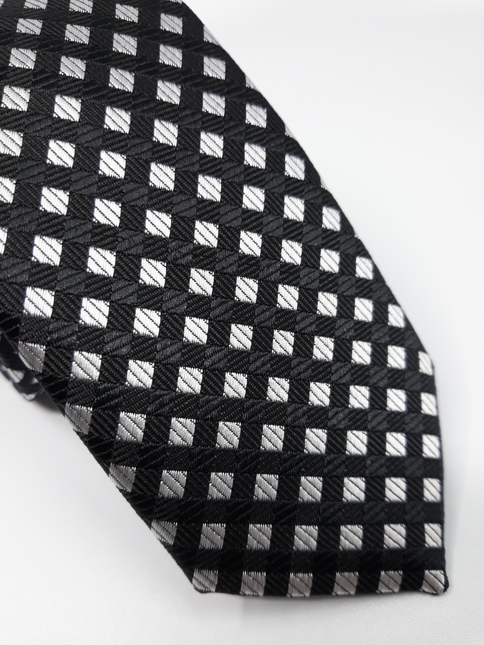 Elegancki krawat męski firmy Piotr o klasycznym i modnym kroju w kolorze biało czarnym-szachownica. Krawat o klasycznym i modnym kroju, wykonany ze sztucznego jedwabiu. Jest on bardzo ważnym elementem ubioru, dzięki któremu każdy mężczyzna może wnieść do swojego stroju odrobinę koloru. Kompletując garderobę należy pamiętać, aby krawat tworzył spójny zestaw z marynarką lub koszulą. Jego unikatowy wzór z pewnością spełni swoją funkcję w połączeniu z różnymi tkaninami w kilku wariantach kolorystycznych. Ponadto wyraźne i mocne akcenty zdobnicze dodadzą charakteru i pozwolą wyróżnić się stylem. Krawat można dobrać zarówno do karnacji, garnituru jak i temperamentu.