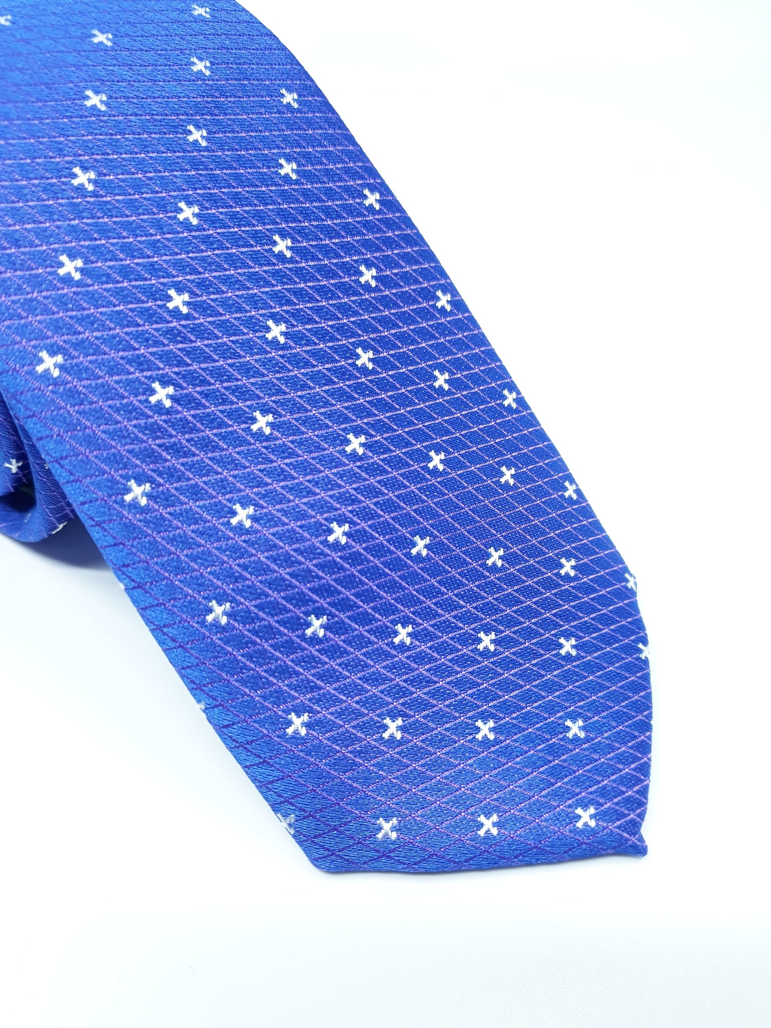 Elegancki krawat męski firmy Piotr o klasycznym i modnym kroju, szafirowy w białe krzyżyki i przeplatany różową nitką.Krawat o klasycznym i modnym kroju, wykonany ze sztucznego jedwabiu. Jest on bardzo ważnym elementem ubioru, dzięki któremu każdy mężczyzna może wnieść do swojego stroju odrobinę koloru. Kompletując garderobę należy pamiętać, aby krawat tworzył spójny zestaw z marynarką lub koszulą. Jego unikatowy wzór z pewnością spełni swoją funkcję w połączeniu z różnymi tkaninami w kilku wariantach kolorystycznych. Ponadto wyraźne i mocne akcenty zdobnicze dodadzą charakteru i pozwolą wyróżnić się stylem. Krawat można dobrać zarówno do karnacji, garnituru jak i temperamentu.