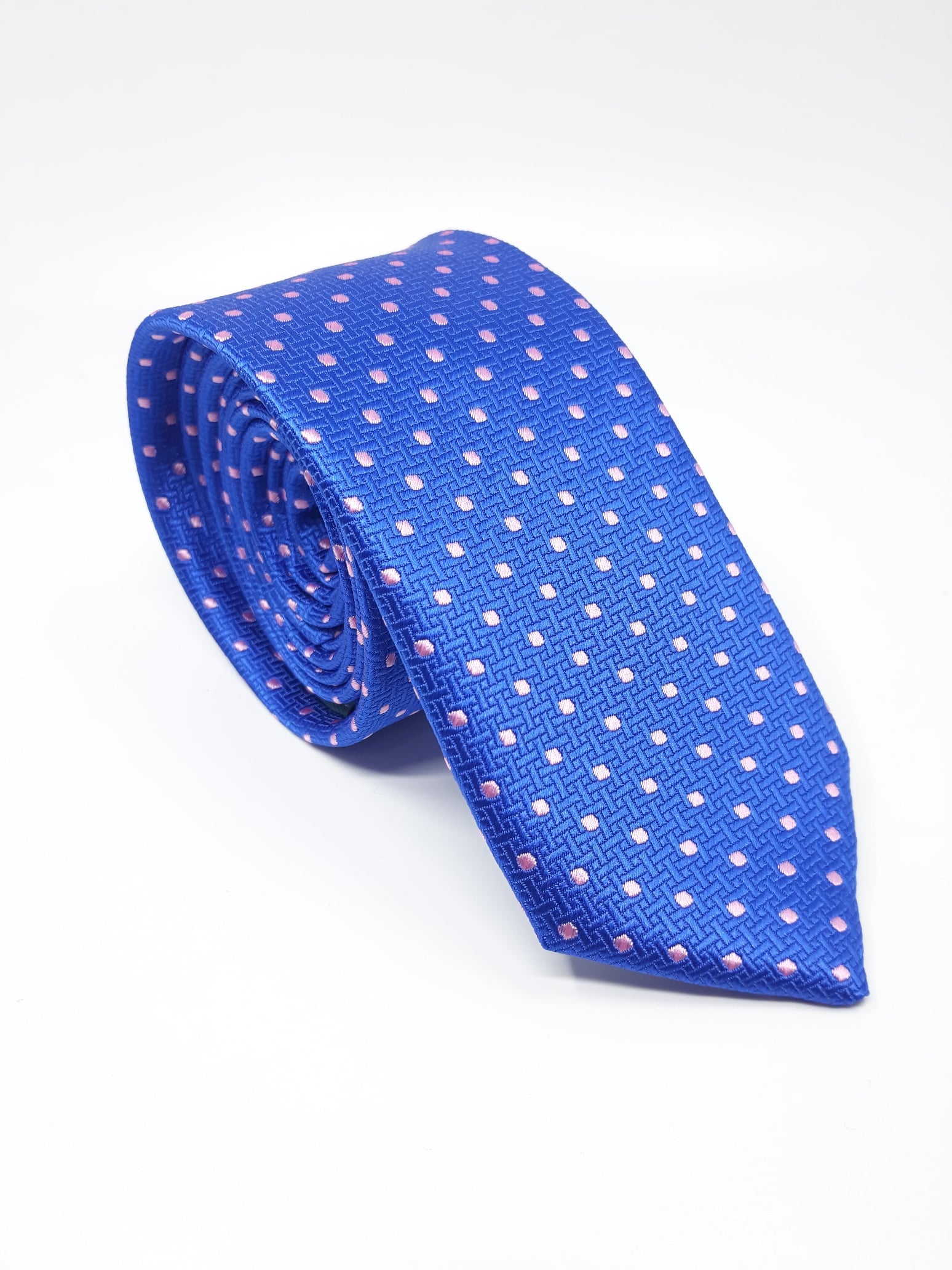 Elegancki krawat męski firmy Piotr o klasycznym i modnym kroju, szafirowy w różowe kropki.Krawat o klasycznym i modnym kroju, wykonany ze sztucznego jedwabiu. Jest on bardzo ważnym elementem ubioru, dzięki któremu każdy mężczyzna może wnieść do swojego stroju odrobinę koloru. Kompletując garderobę należy pamiętać, aby krawat tworzył spójny zestaw z marynarką lub koszulą. Jego unikatowy wzór z pewnością spełni swoją funkcję w połączeniu z różnymi tkaninami w kilku wariantach kolorystycznych. Ponadto wyraźne i mocne akcenty zdobnicze dodadzą charakteru i pozwolą wyróżnić się stylem. Krawat można dobrać zarówno do karnacji, garnituru jak i temperamentu.