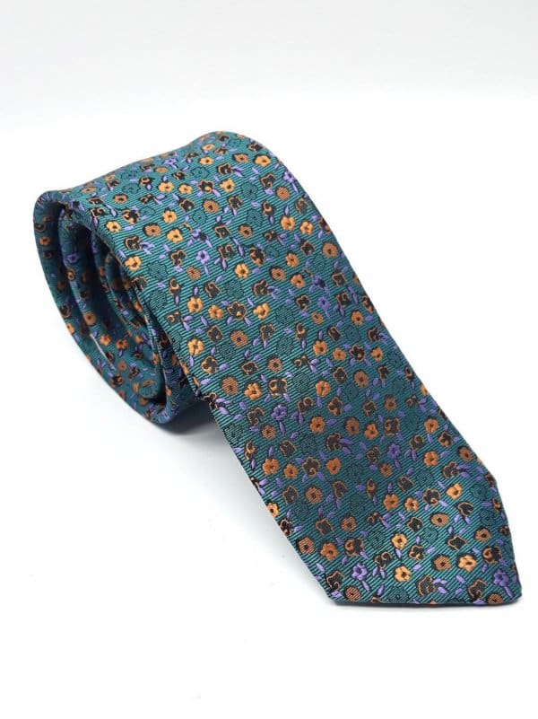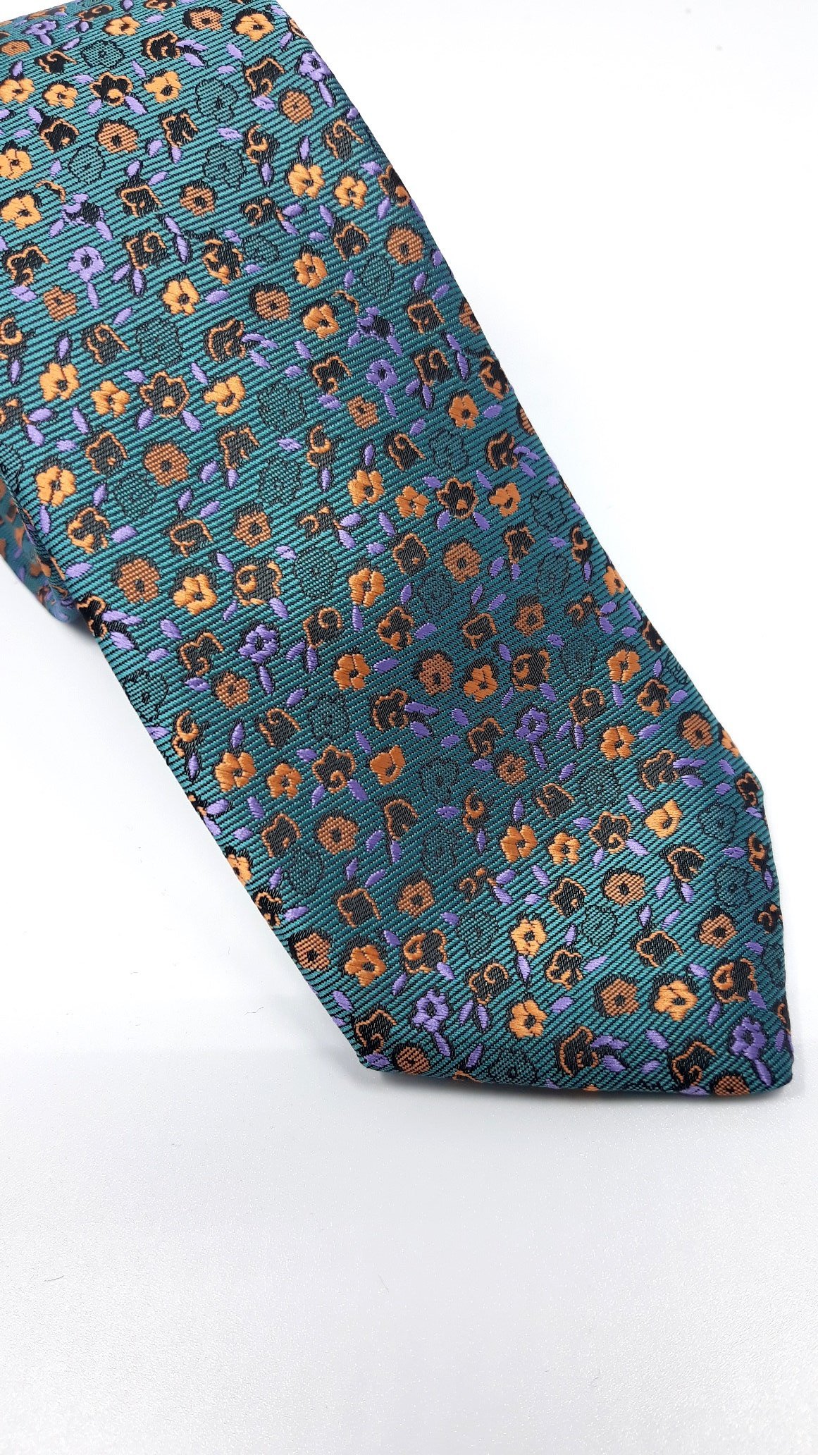 Elegancki krawat męski firmy Piotr o klasycznym i modnym kroju, turkusowy w pomarańczowe kwiatki.Krawat o klasycznym i modnym kroju, wykonany ze sztucznego jedwabiu. Jest on bardzo ważnym elementem ubioru, dzięki któremu każdy mężczyzna może wnieść do swojego stroju odrobinę koloru. Kompletując garderobę należy pamiętać, aby krawat tworzył spójny zestaw z marynarką lub koszulą. Jego unikatowy wzór z pewnością spełni swoją funkcję w połączeniu z różnymi tkaninami w kilku wariantach kolorystycznych. Ponadto wyraźne i mocne akcenty zdobnicze dodadzą charakteru i pozwolą wyróżnić się stylem. Krawat można dobrać zarówno do karnacji, garnituru jak i temperamentu.