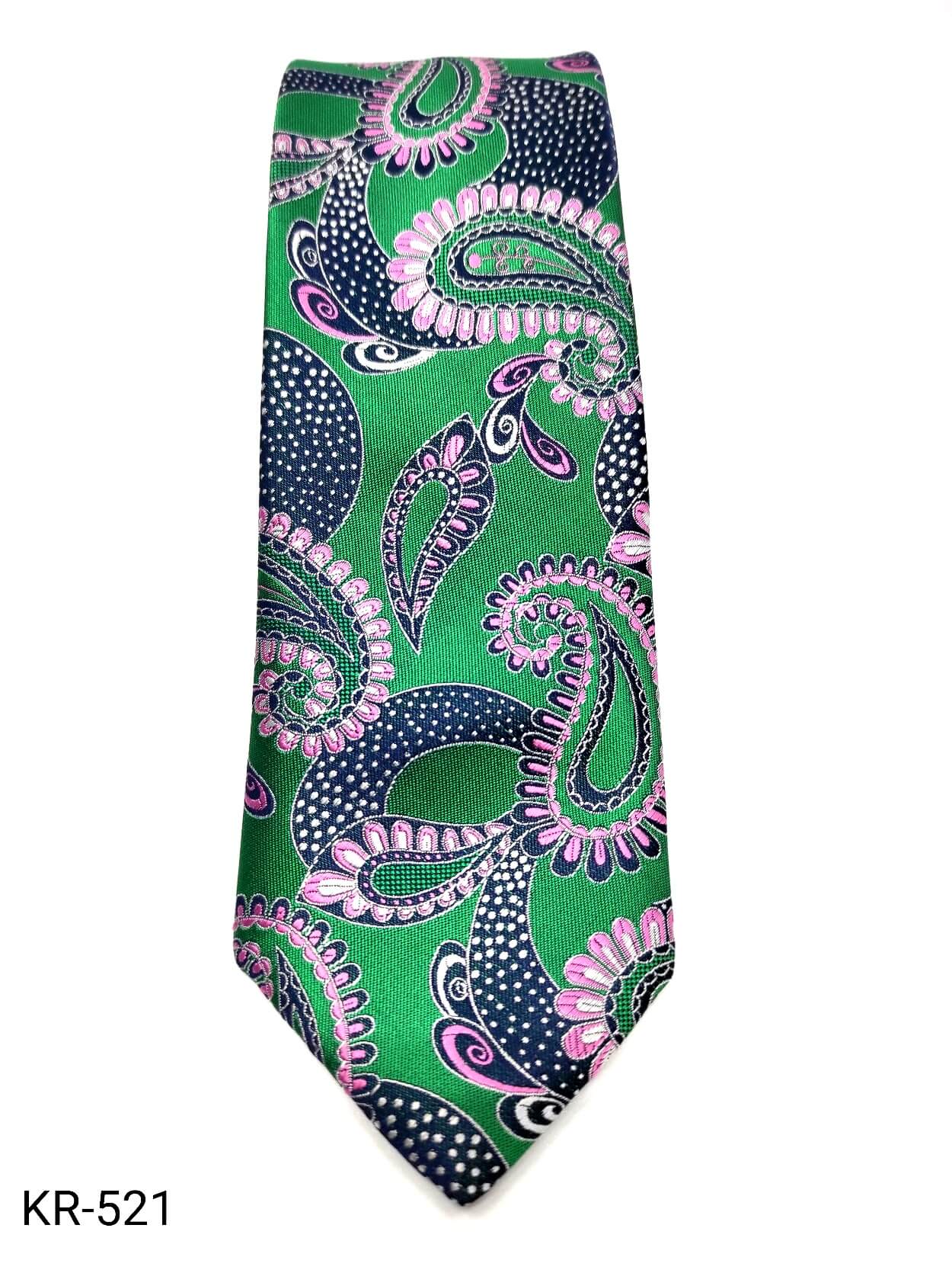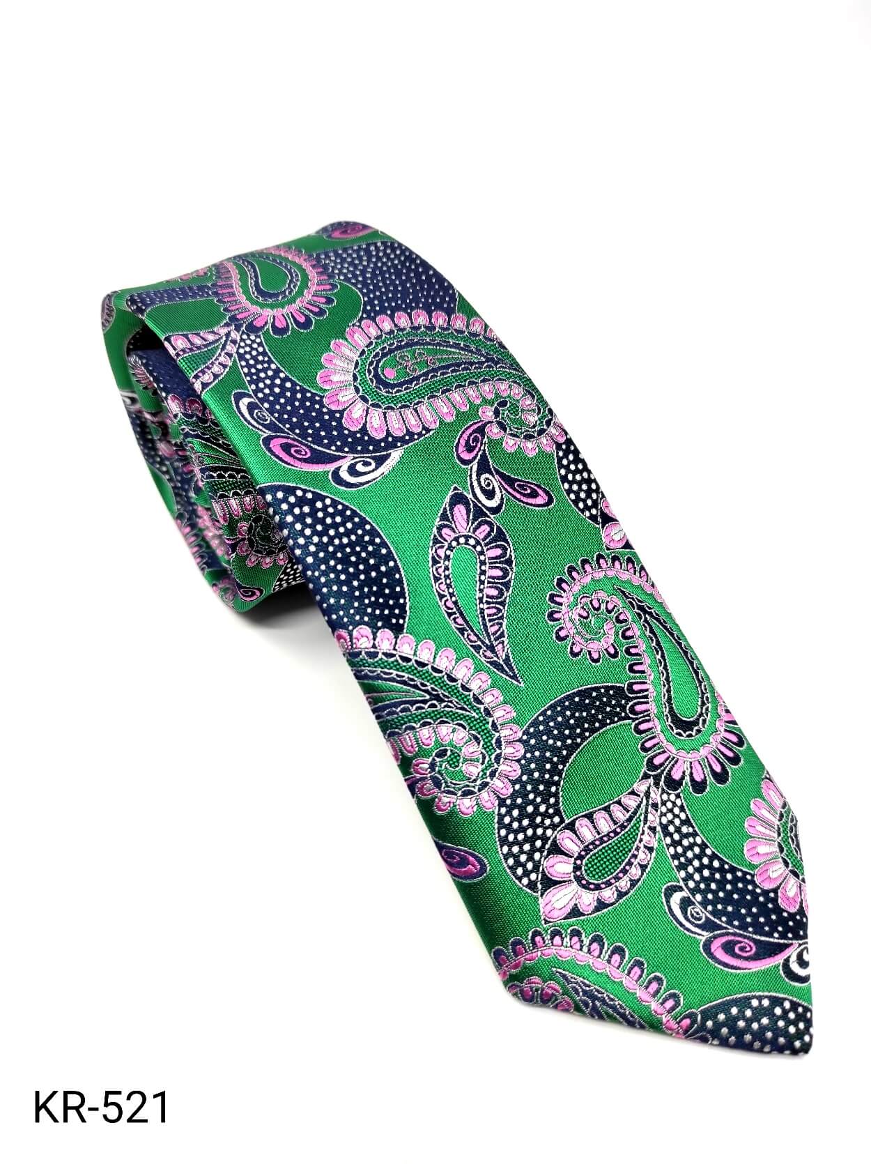 Elegancki krawat męski firmy Piotr o klasycznym i modnym kroju w kolorze zielonym z różowym wzorem.Krawat o klasycznym i modnym kroju, wykonany ze sztucznego jedwabiu. Jest on bardzo ważnym elementem ubioru, dzięki któremu każdy mężczyzna może wnieść do swojego stroju odrobinę koloru. Kompletując garderobę należy pamiętać, aby krawat tworzył spójny zestaw z marynarką lub koszulą. Jego unikatowy wzór z pewnością spełni swoją funkcję w połączeniu z różnymi tkaninami w kilku wariantach kolorystycznych. Ponadto wyraźne i mocne akcenty zdobnicze dodadzą charakteru i pozwolą wyróżnić się stylem. Krawat można dobrać zarówno do karnacji, garnituru jak i temperamentu.