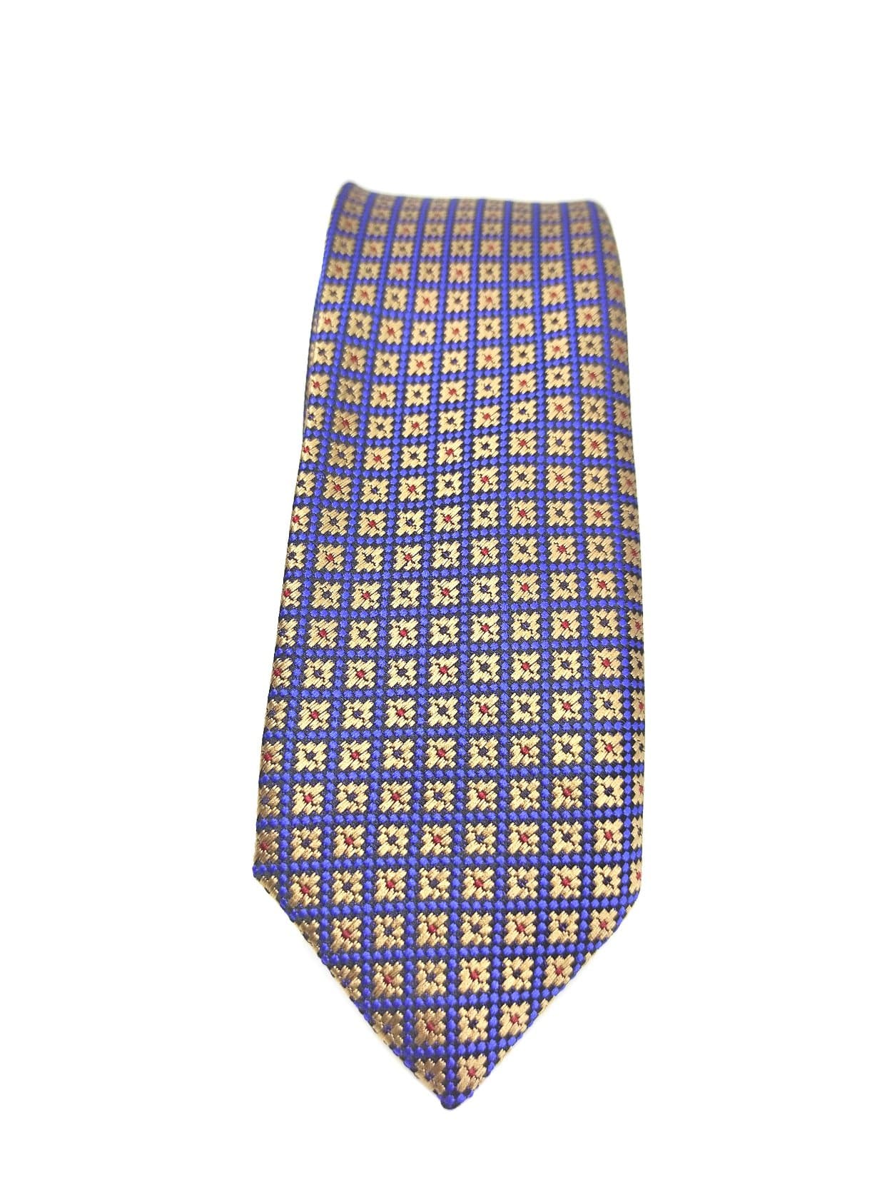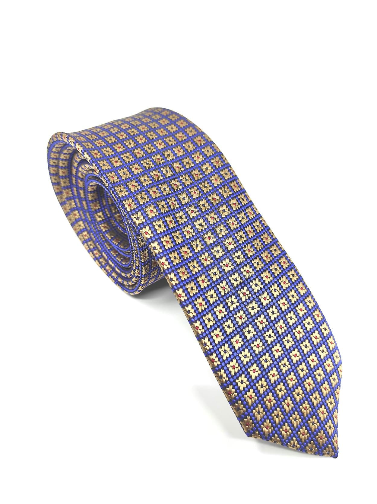 Elegancki krawat męski firmy Piotr niebieski w złote kwadraty o klasycznym i modnym kroju.Krawat o klasycznym i modnym kroju, wykonany ze sztucznego jedwabiu. Jest on bardzo ważnym elementem ubioru, dzięki któremu każdy mężczyzna może wnieść do swojego stroju odrobinę koloru. Kompletując garderobę należy pamiętać, aby krawat tworzył spójny zestaw z marynarką lub koszulą. Jego unikatowy wzór z pewnością spełni swoją funkcję w połączeniu z różnymi tkaninami w kilku wariantach kolorystycznych. Ponadto wyraźne i mocne akcenty zdobnicze dodadzą charakteru i pozwolą wyróżnić się stylem. Krawat można dobrać zarówno do karnacji, garnituru jak i temperamentu.