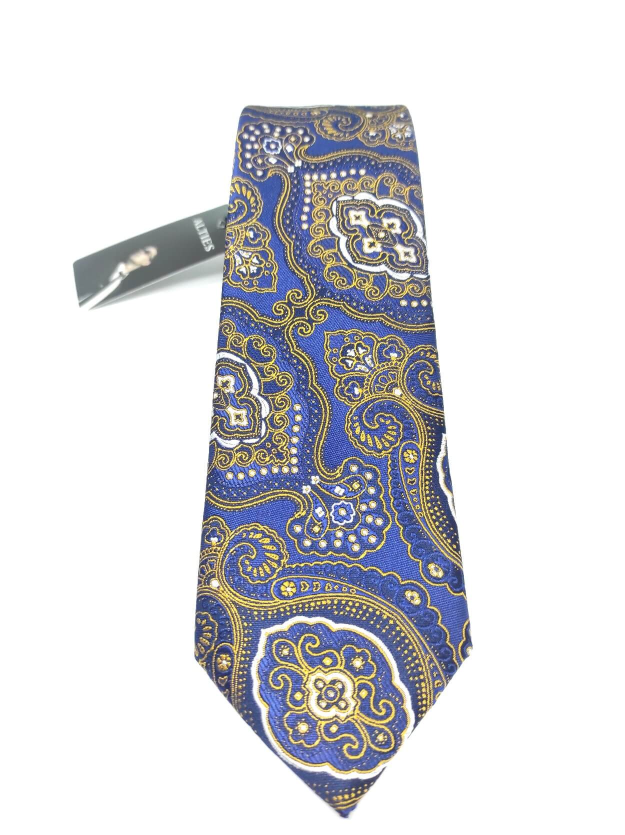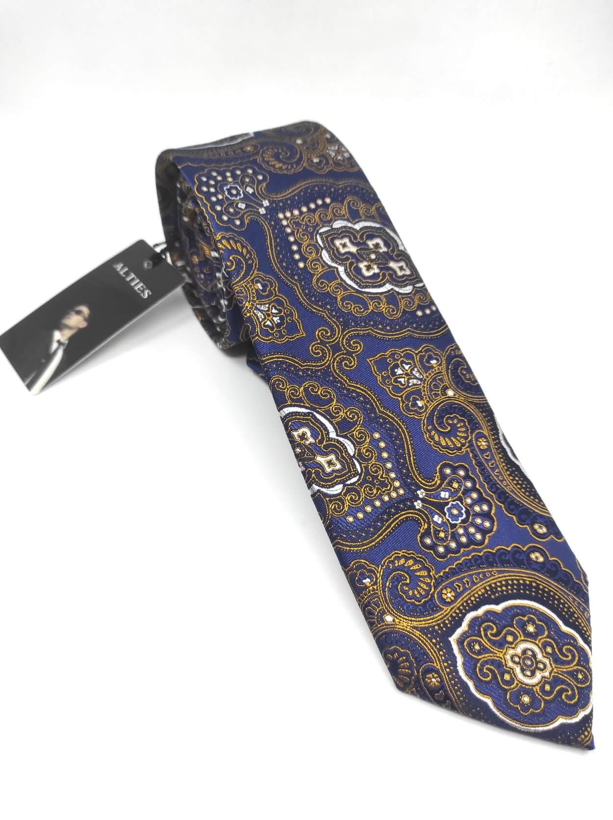 Elegancki krawat męski firmy Alties o klasycznym i modnym kroju,granatowy w złoty wzór turecki. Krawat o klasycznym i modnym kroju, wykonany z microfibry. Jest on bardzo ważnym elementem ubioru, dzięki któremu każdy mężczyzna może wnieść do swojego stroju odrobinę koloru. Kompletując garderobę należy pamiętać, aby krawat tworzył spójny zestaw z marynarką lub koszulą. Jego unikatowy wzór z pewnością spełni swoją funkcję w połączeniu z różnymi tkaninami w kilku wariantach kolorystycznych. Ponadto wyraźne i mocne akcenty zdobnicze dodadzą charakteru i pozwolą wyróżnić się stylem. Krawat można dobrać zarówno do karnacji, garnituru jak i temperamentu.