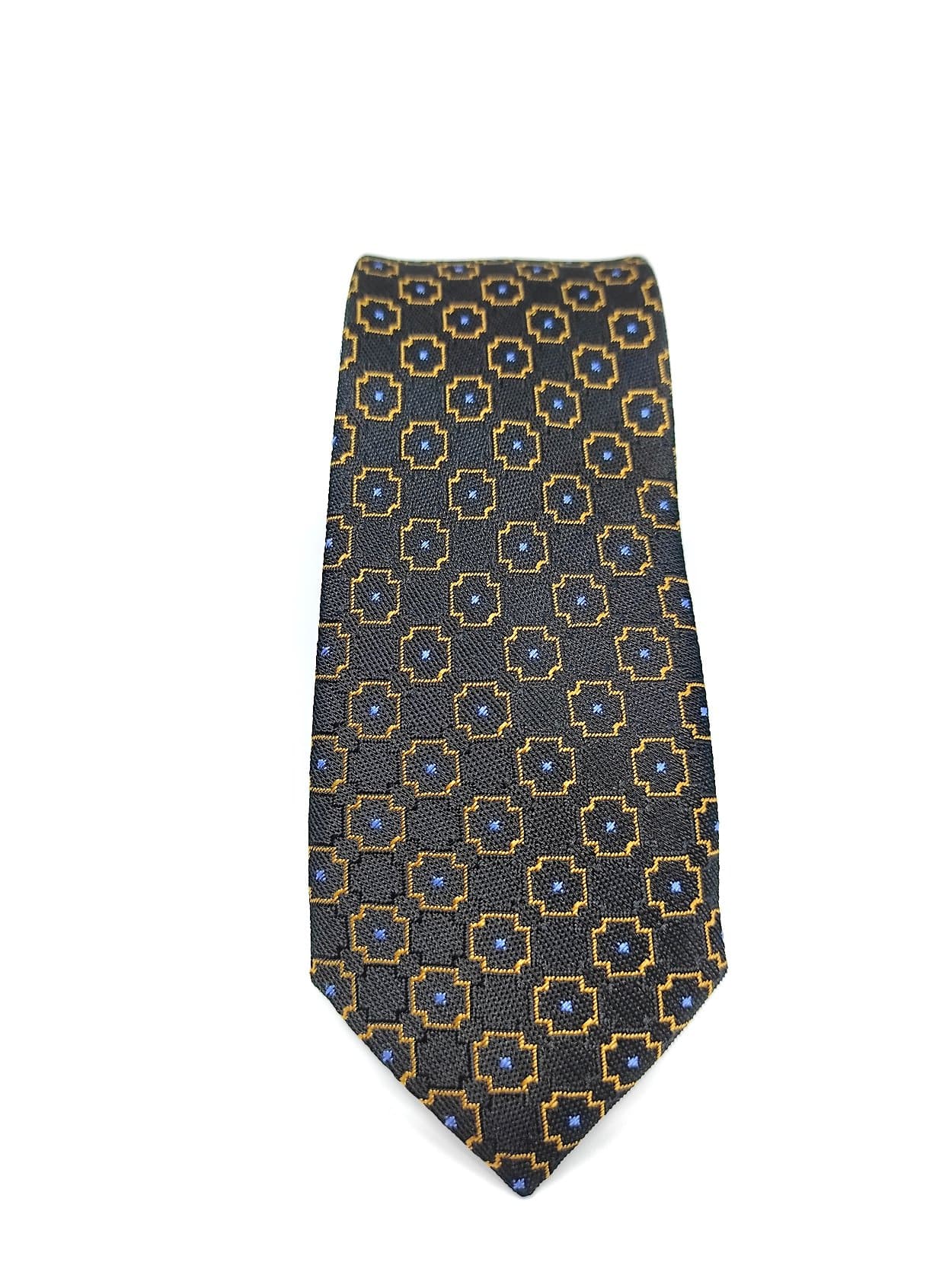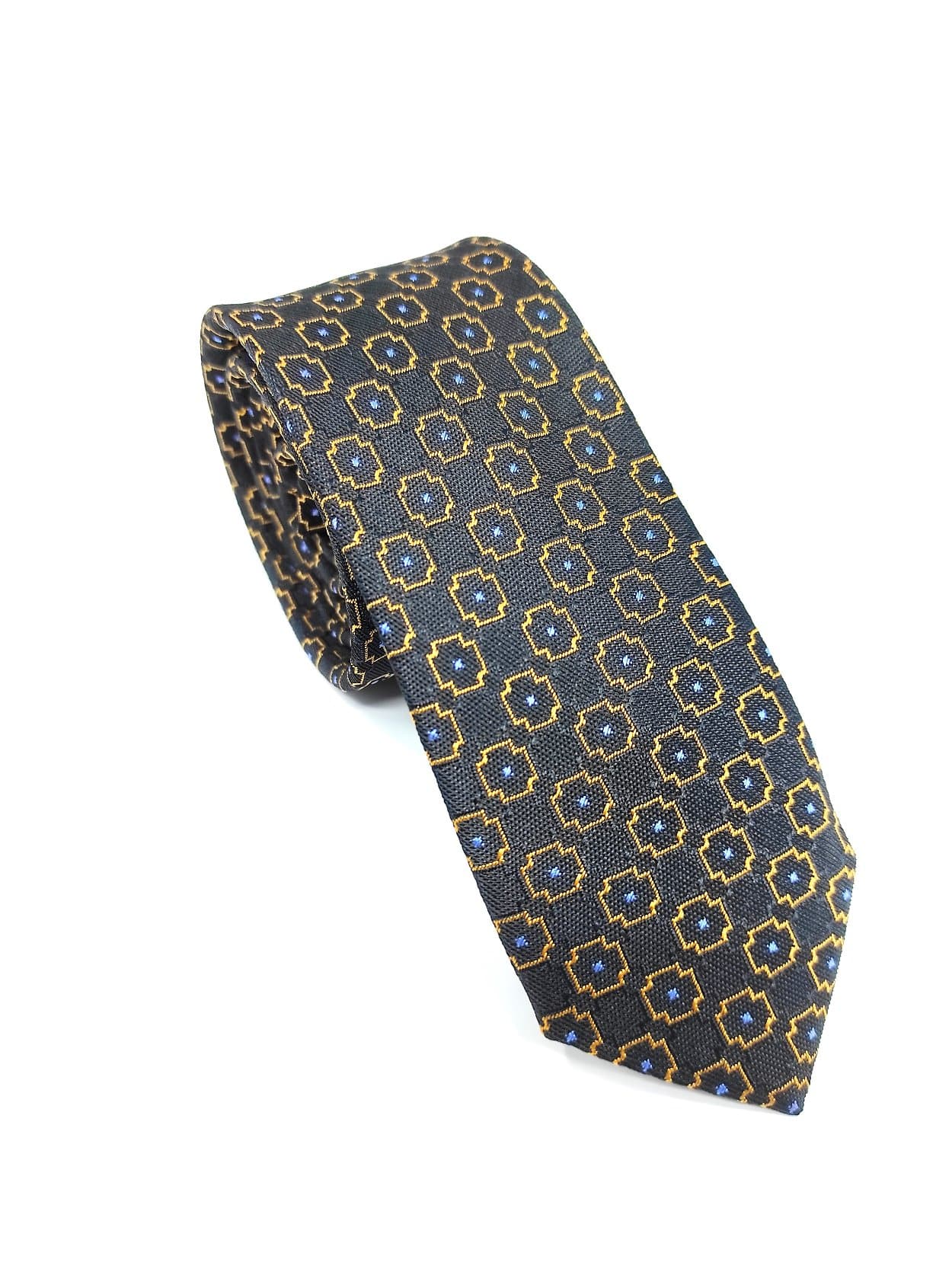 Elegancki krawat męski firmy Piotr czarny w złoty wzór z błękitnymi kropeczkami o klasycznym i modnym kroju.Krawat o klasycznym i modnym kroju, wykonany ze sztucznego jedwabiu. Jest on bardzo ważnym elementem ubioru, dzięki któremu każdy mężczyzna może wnieść do swojego stroju odrobinę koloru. Kompletując garderobę należy pamiętać, aby krawat tworzył spójny zestaw z marynarką lub koszulą. Jego unikatowy wzór z pewnością spełni swoją funkcję w połączeniu z różnymi tkaninami w kilku wariantach kolorystycznych. Ponadto wyraźne i mocne akcenty zdobnicze dodadzą charakteru i pozwolą wyróżnić się stylem. Krawat można dobrać zarówno do karnacji, garnituru jak i temperamentu.