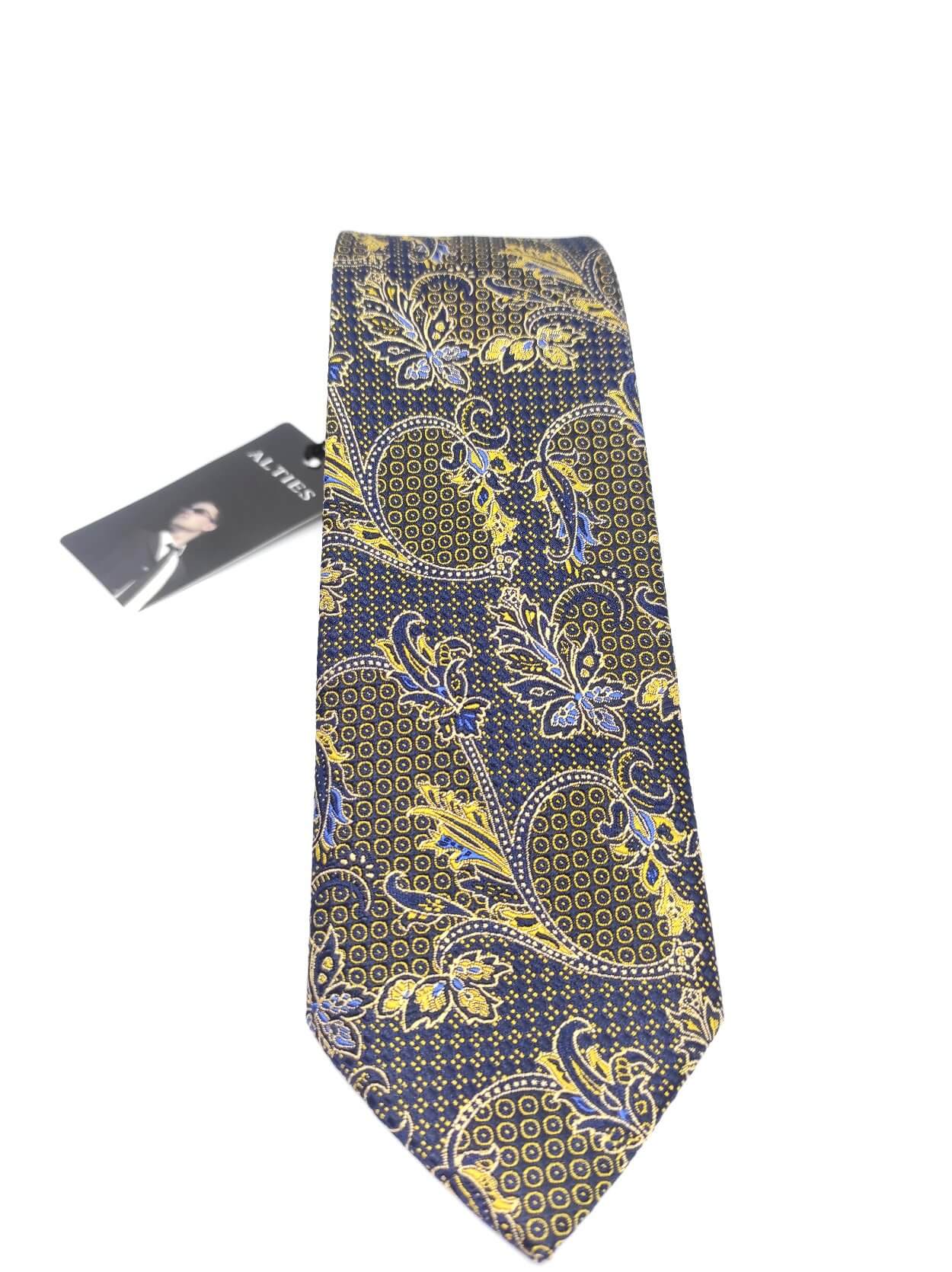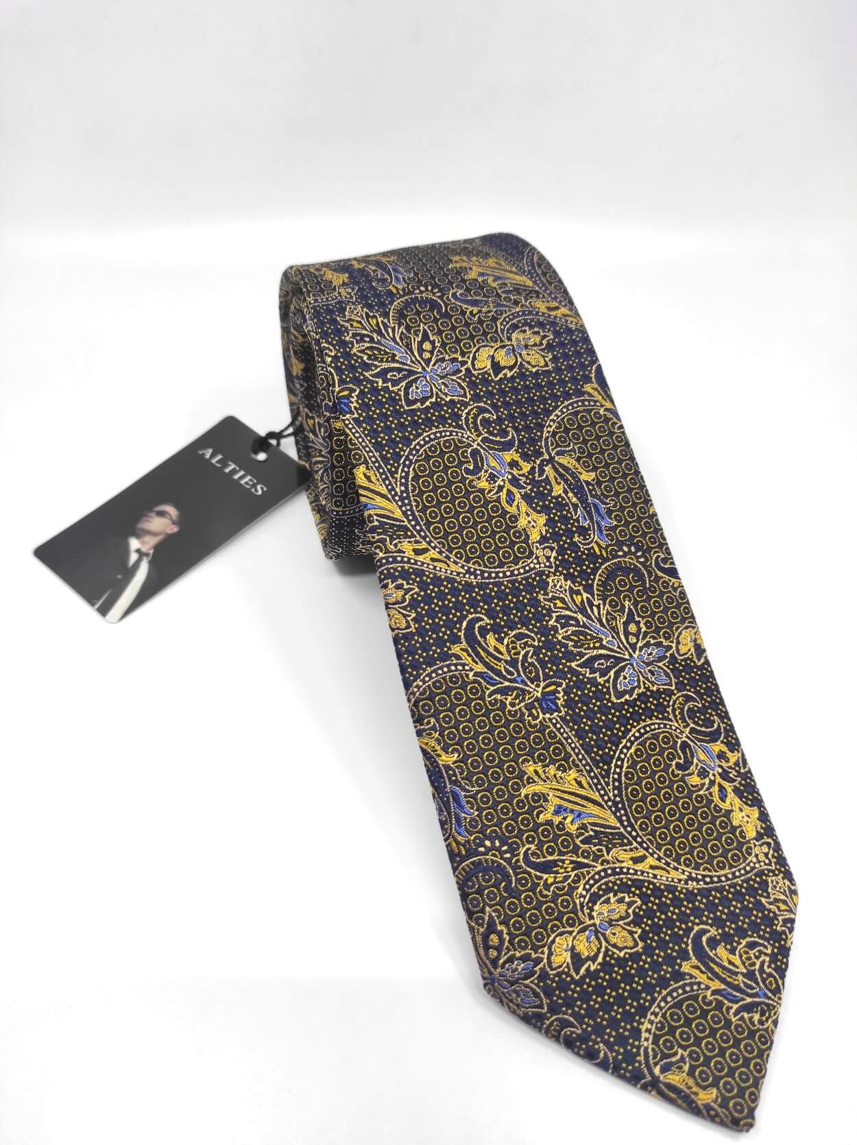 Elegancki krawat męski firmy Alties o klasycznym i modnym kroju,granatowy w złoty wzór. Krawat o klasycznym i modnym kroju, wykonany z microfibry. Jest on bardzo ważnym elementem ubioru, dzięki któremu każdy mężczyzna może wnieść do swojego stroju odrobinę koloru. Kompletując garderobę należy pamiętać, aby krawat tworzył spójny zestaw z marynarką lub koszulą. Jego unikatowy wzór z pewnością spełni swoją funkcję w połączeniu z różnymi tkaninami w kilku wariantach kolorystycznych. Ponadto wyraźne i mocne akcenty zdobnicze dodadzą charakteru i pozwolą wyróżnić się stylem. Krawat można dobrać zarówno do karnacji, garnituru jak i temperamentu.