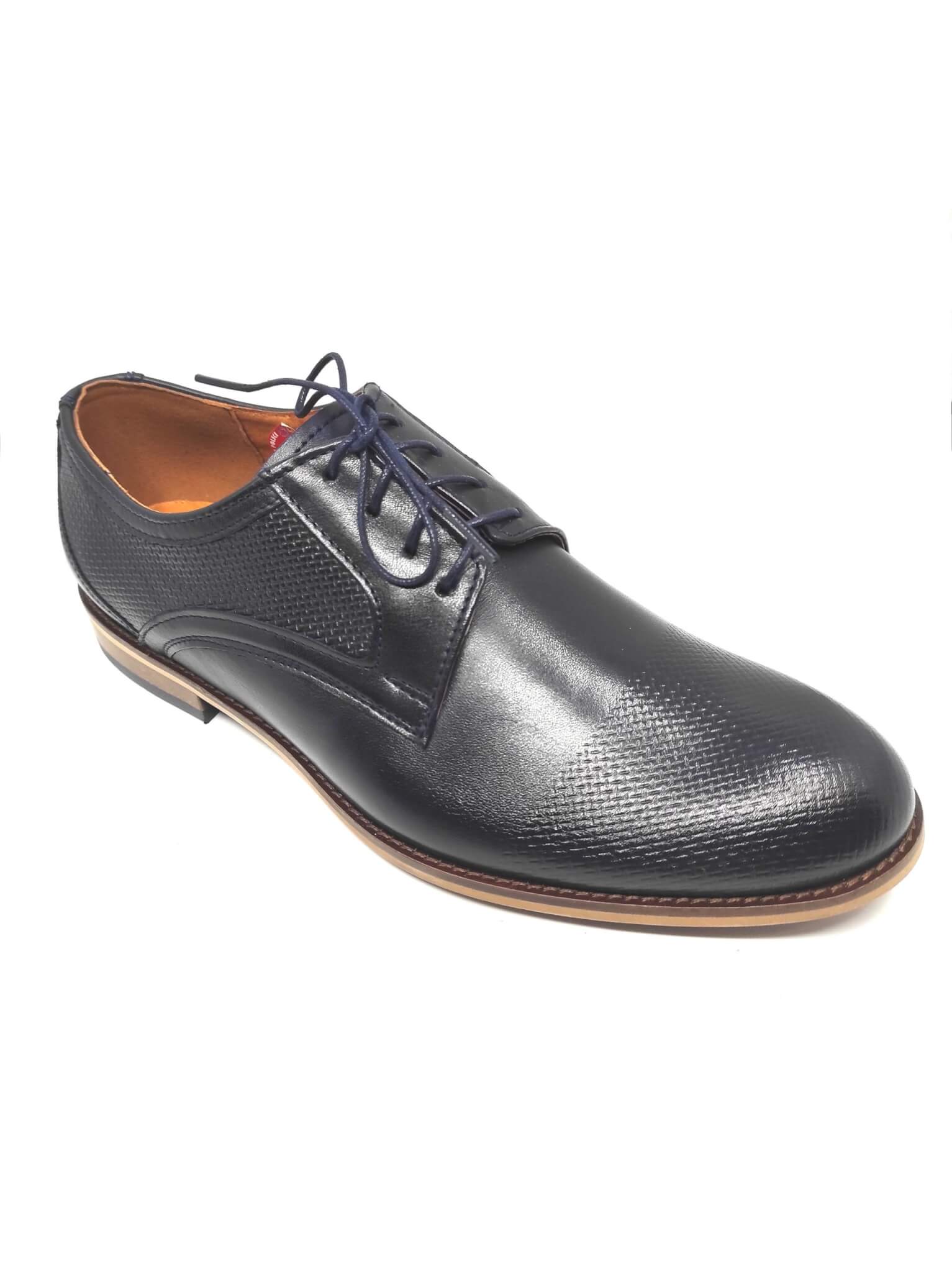 Eleganckie, skórzane męskie pantofle wykonane z granatowej skóry bydlęcej. Buty mają spiczaste noski więc obuwie prezentuje się stylowo i elegancko natomiast miękka, skórzana, znakomicie wyprofilowana wkładka wewnątrz obuwia zapewnia komfort podczas chodzenia.