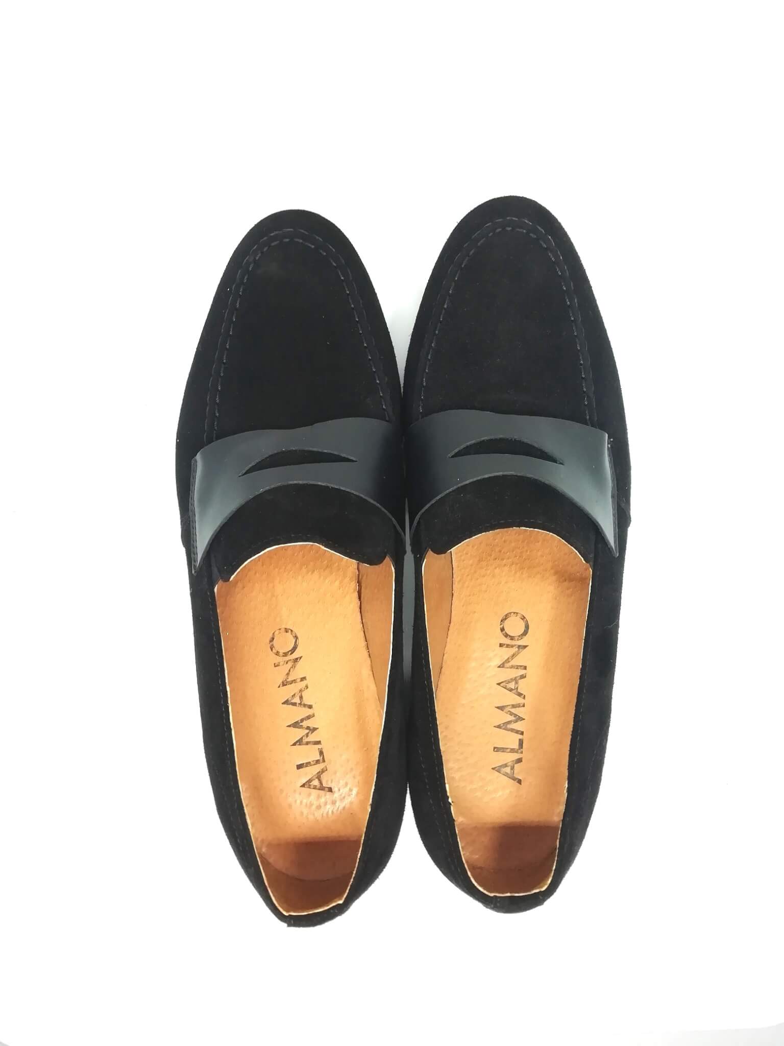 Eleganckie męskie mokasyny czarne, wykonane z naturalnej skóry zamszowej. Posiadają ciemne obszycie i ozdobny pasek ze skóry czarnej. Obuwie z pewnością znakomicie prezentuje się w stylizacjach casualowych jak i eleganckich.