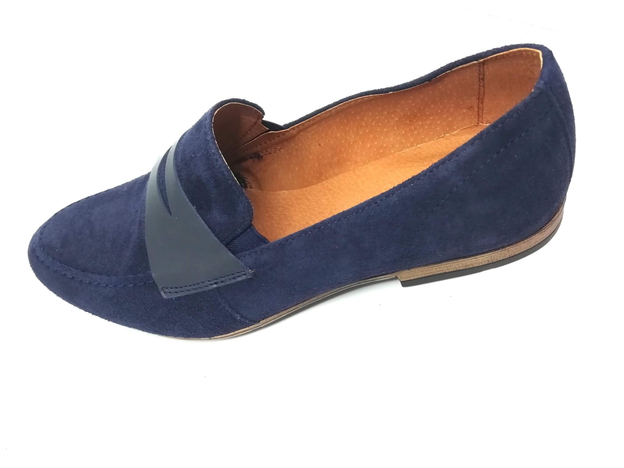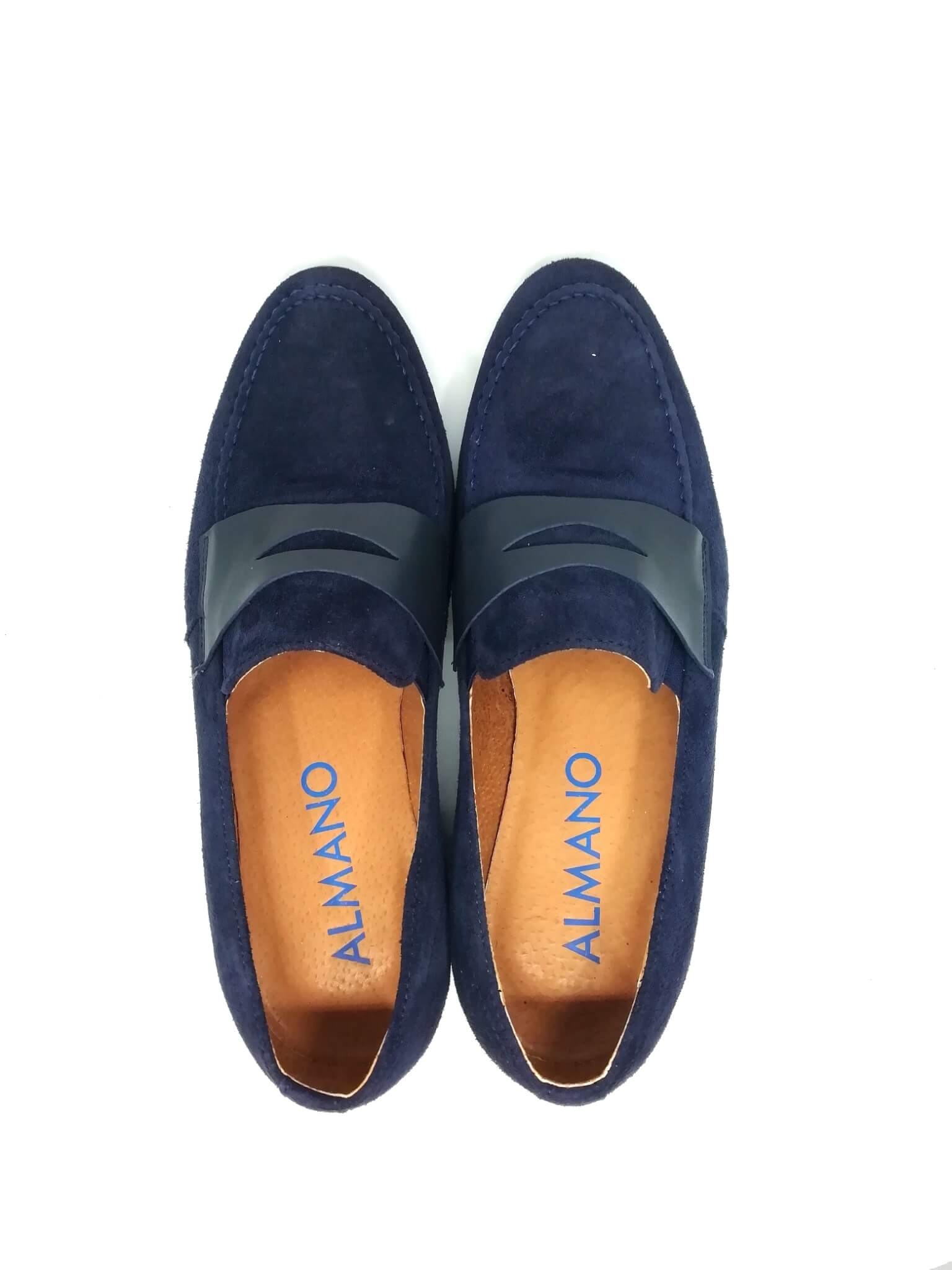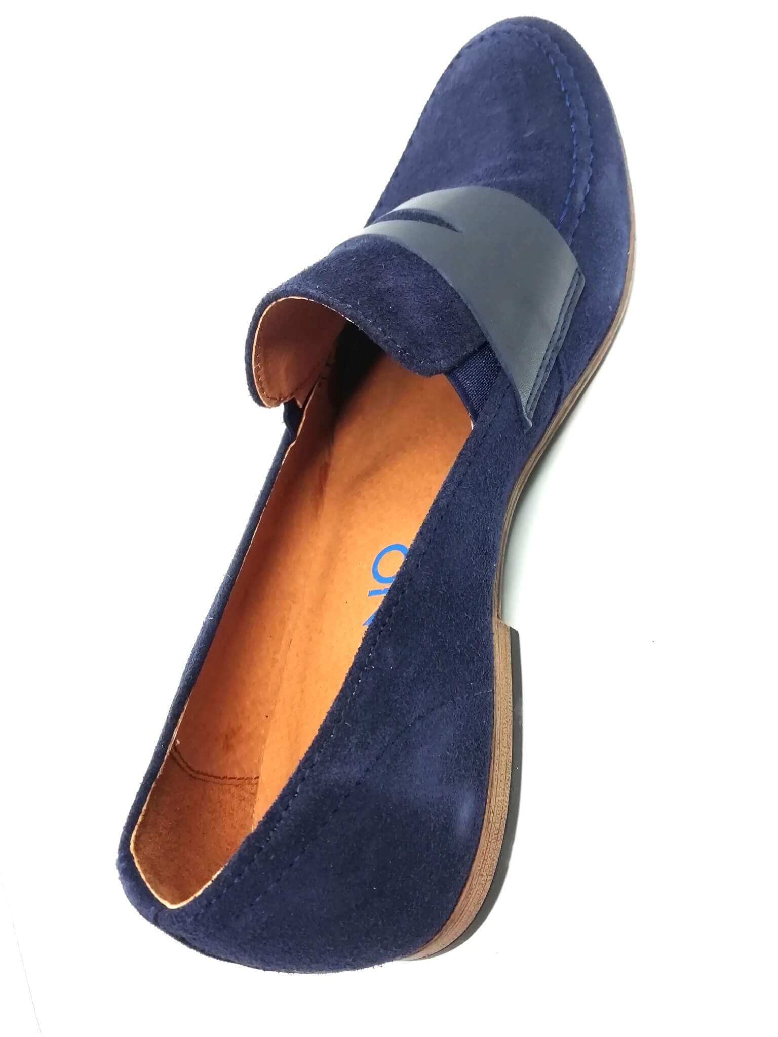 Eleganckie męskie mokasyny granatowe, wykonane z naturalnej skóry zamszowej. Posiadają niebieskie obszycie i ozdobny pasek ze skóry. Obuwie z pewnością znakomicie prezentuje się w stylizacjach casualowych jak i eleganckich.