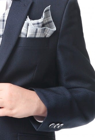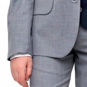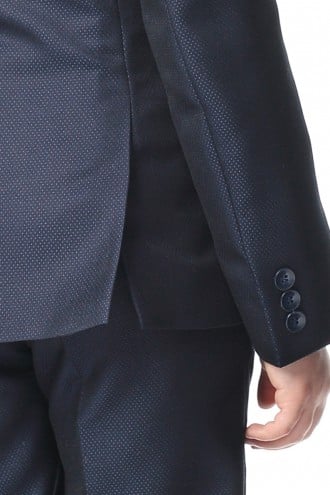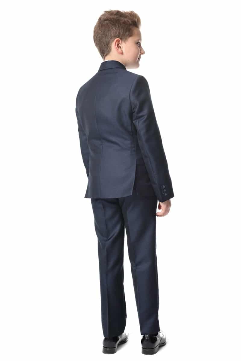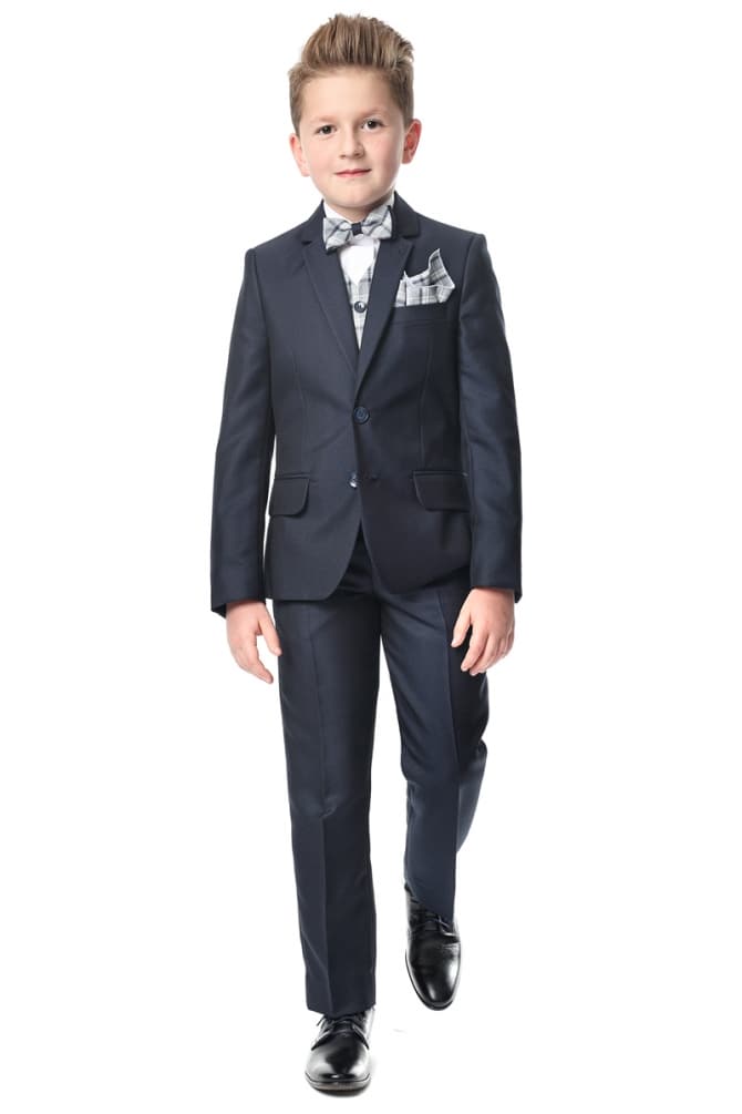 Garnitur dziecięcy wykonany z z tkaniny garniturowej – strukturalnej i delikatnie błyszczącej w modnym ciemnogranatowym kolorze. Marynarkę zapinamy na dwa guziki. Ma bardzo modny taliowany krój. Spodnie również są slimowane w związku z tym idealnie dopasowuje się do sylwetki. Spodnie posiadają wygodną,praktyczną regulację obwodu pasa (guziki i gumki po wewnętrznej stronie paska). Dółu spodni nie podwijamy gdyż pozwala to dopasować długość przed samą uroczystością. Tył marynarki posiada dwa rozcięcia która podobnie do wzoru męskiego posiada dwie kieszenie dolne z patkami i kieszonkę piersiową. Garnitury chłopięce z pewnością posłużą na komunię, wesela, egzaminy szkolne i inne okazje szkolne i rodzinne.