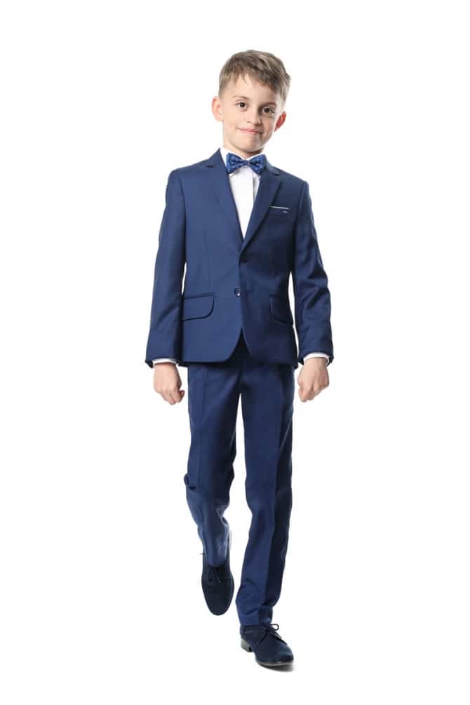 Garnitur dziecięcy wykonany z gładkiej tkaniny w najmodniejszym obecnie kolorze szafirowym. Marynarkę zapinamy na dwa guziki. Ma bardzo modny taliowany krój. Spodnie również są slimowane w związku z tym idealnie dopasowuje się do sylwetki. Spodnie posiadają wygodną,praktyczną regulację obwodu pasa (guziki i gumki po wewnętrznej stronie paska). Dół spodni nie jest podwinięty gdyż pozwala to dopasować długość przed samą uroczystością. Kieszonka piersiowa posiada białą poszetkę. Tył marynarki posiada dwa rozcięcia. Garnitury chłopięce z pewnością posłużą na komunię, wesela, egzaminy szkolne i inne okazje szkolne i rodzinne.