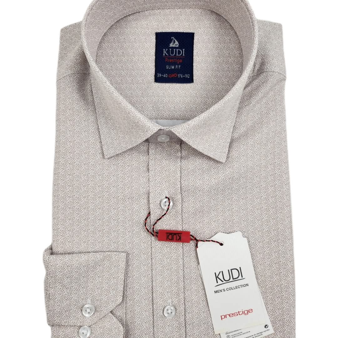 Elegancka Koszula z najnowszej kolekcji firmy Kudi Beżowa w Białe Kropeczki/Wzorek.