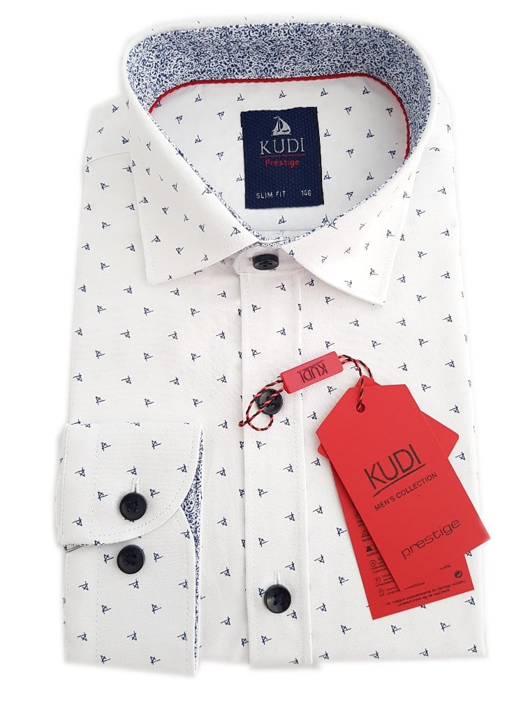 Koszula dziecięca biała granat z długim rękawem z mankietem zapinanym na guziki. Kołnierzyk koszulowy podpinany pod spodem guziczkami. Koszula ma krój slim fit podobnie do koszul męskich. Zapięcie z przodu na granatowe guziki. Ubranko wykonane ze 80% bawełny co sprawia że koszula jest miła w dotyku oraz dla ciała. Materiał biały we wzorek , wykończony granatem. Rozmiarówka typowa dla danego wzrostu, rozmiary od 98 do 164. Dobierając koszule dla chłopca można dobrać identyczną również dla taty. Zapraszamy na nasze pozostałe strony z koszulami dla naszych Panów.