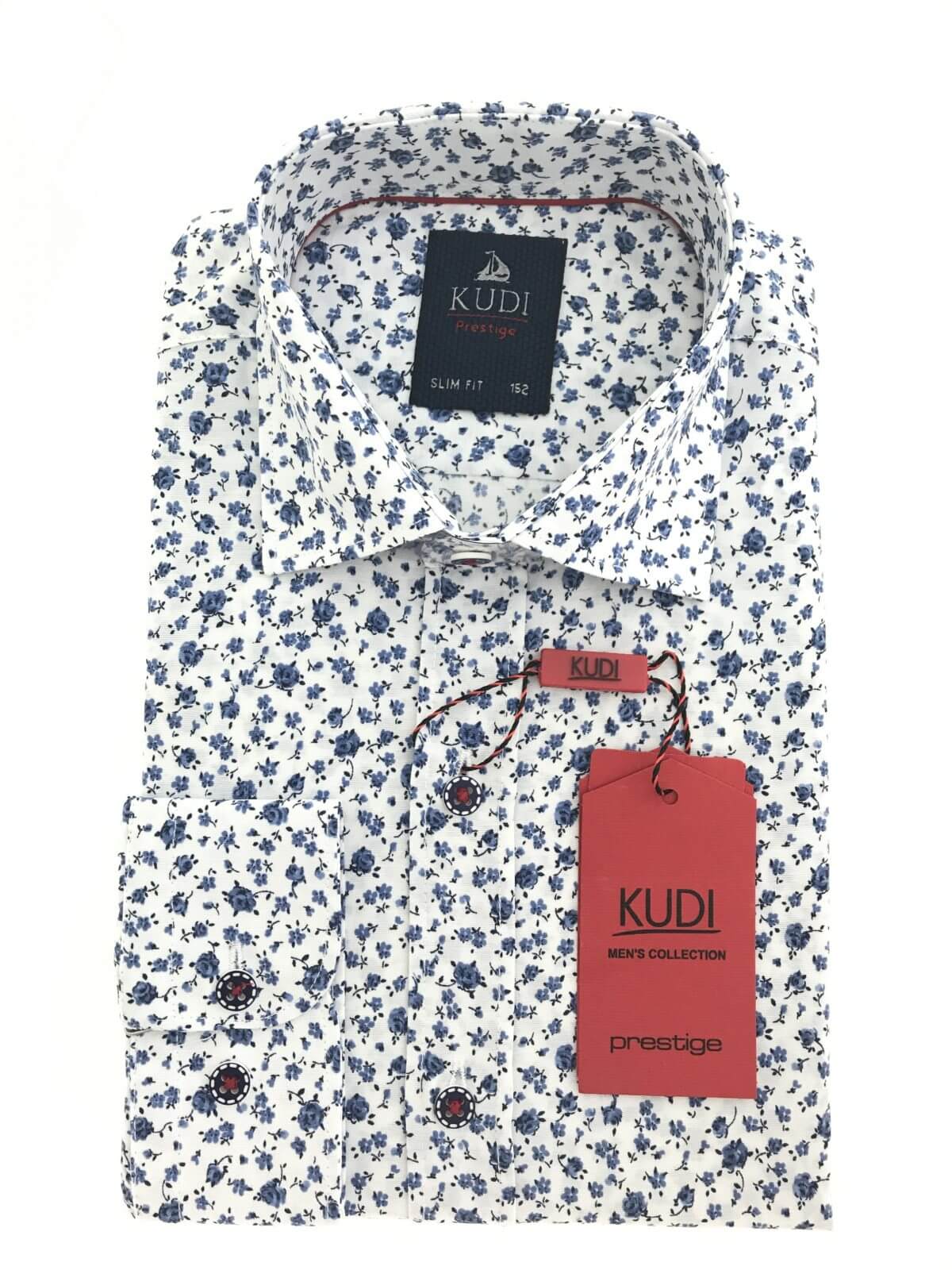 Wizytowa koszula biała dziecięca w kwiatuszki. Sprawdzi się zarówno do garnituru jak i jeansów czy casualowych spodni. Koszula o klasycznym kroju z długim rękawem, zapinana na granatowe guziczki.
