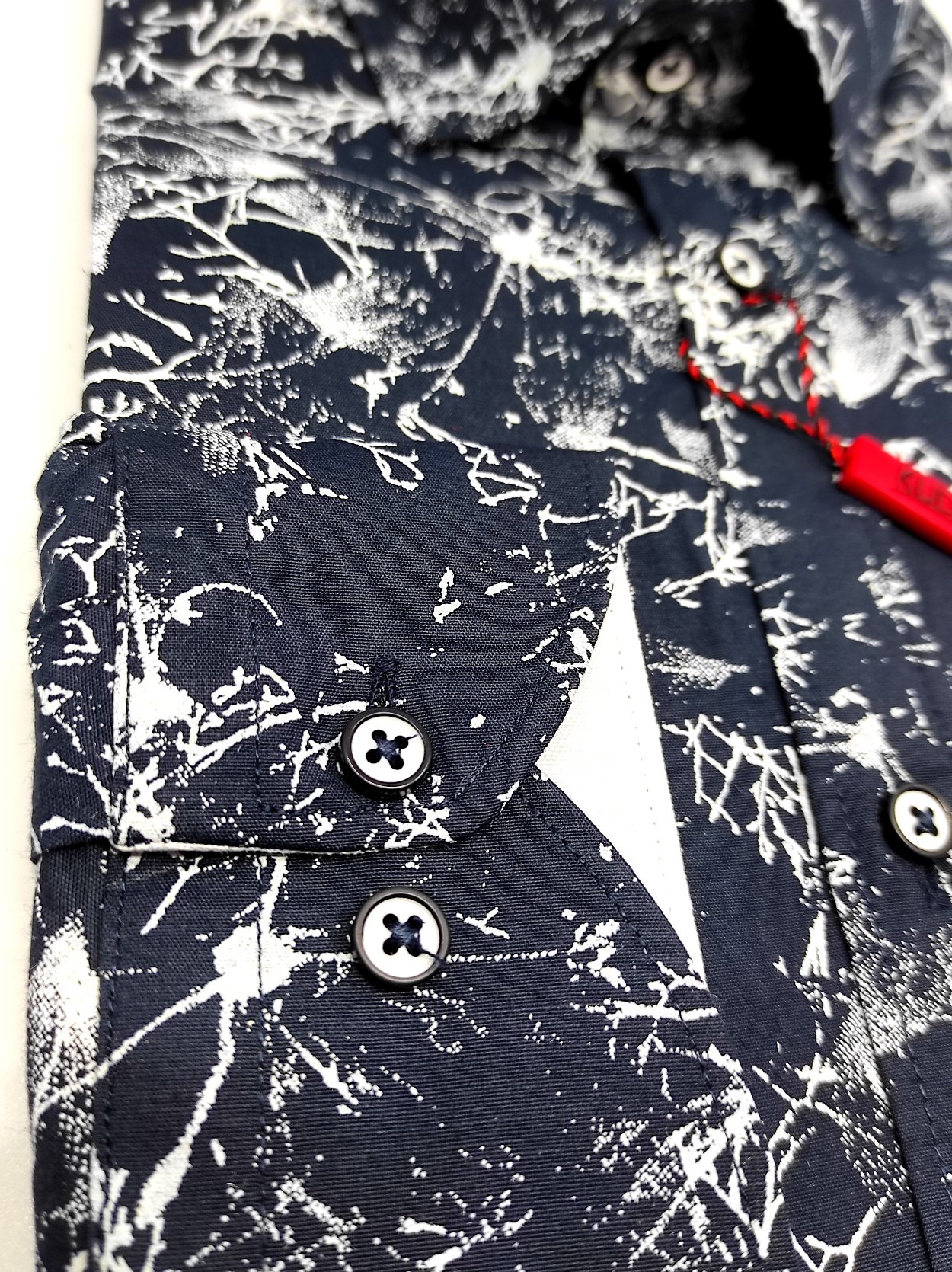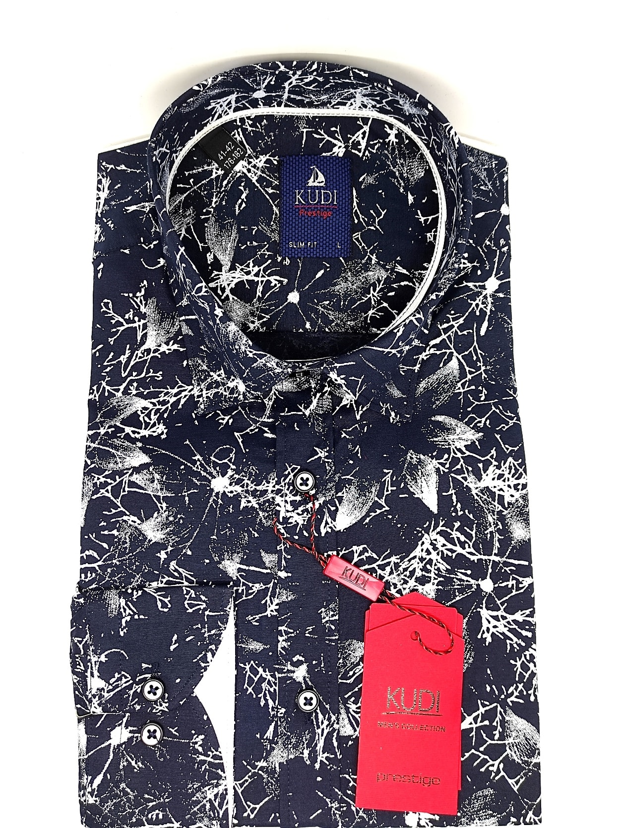 Koszula z najnowszej kolekcji firmy Kudi Granatowa w Biały Wzór .