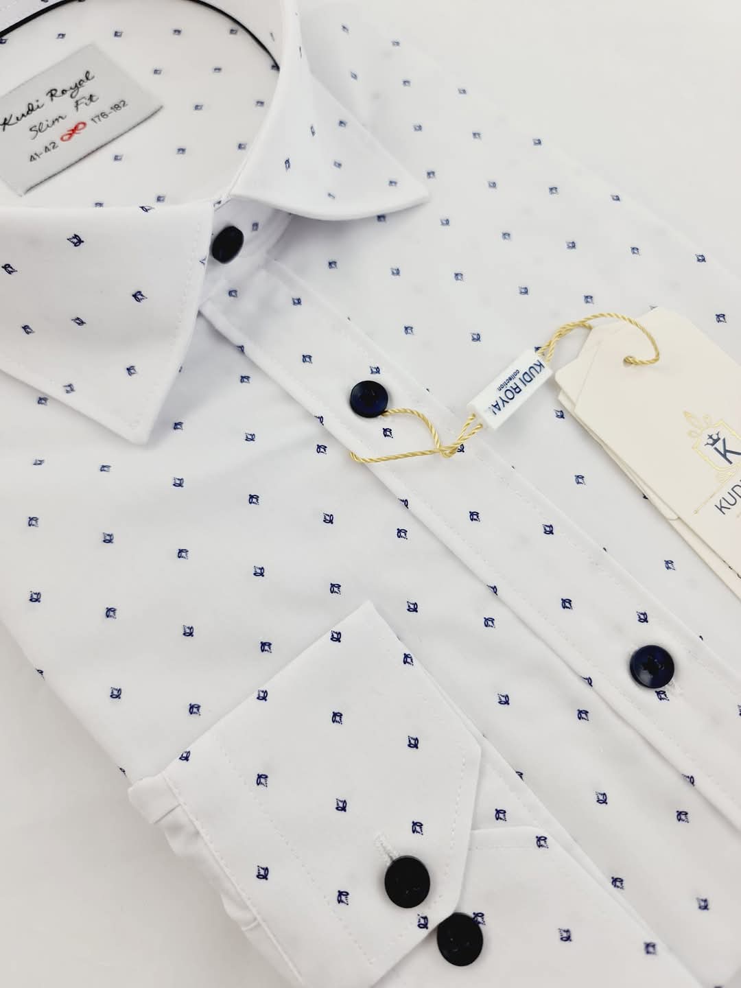 Elegancka Koszula z najnowszej kolekcji firmy Kudi Biała w Granatowy Wzorek.