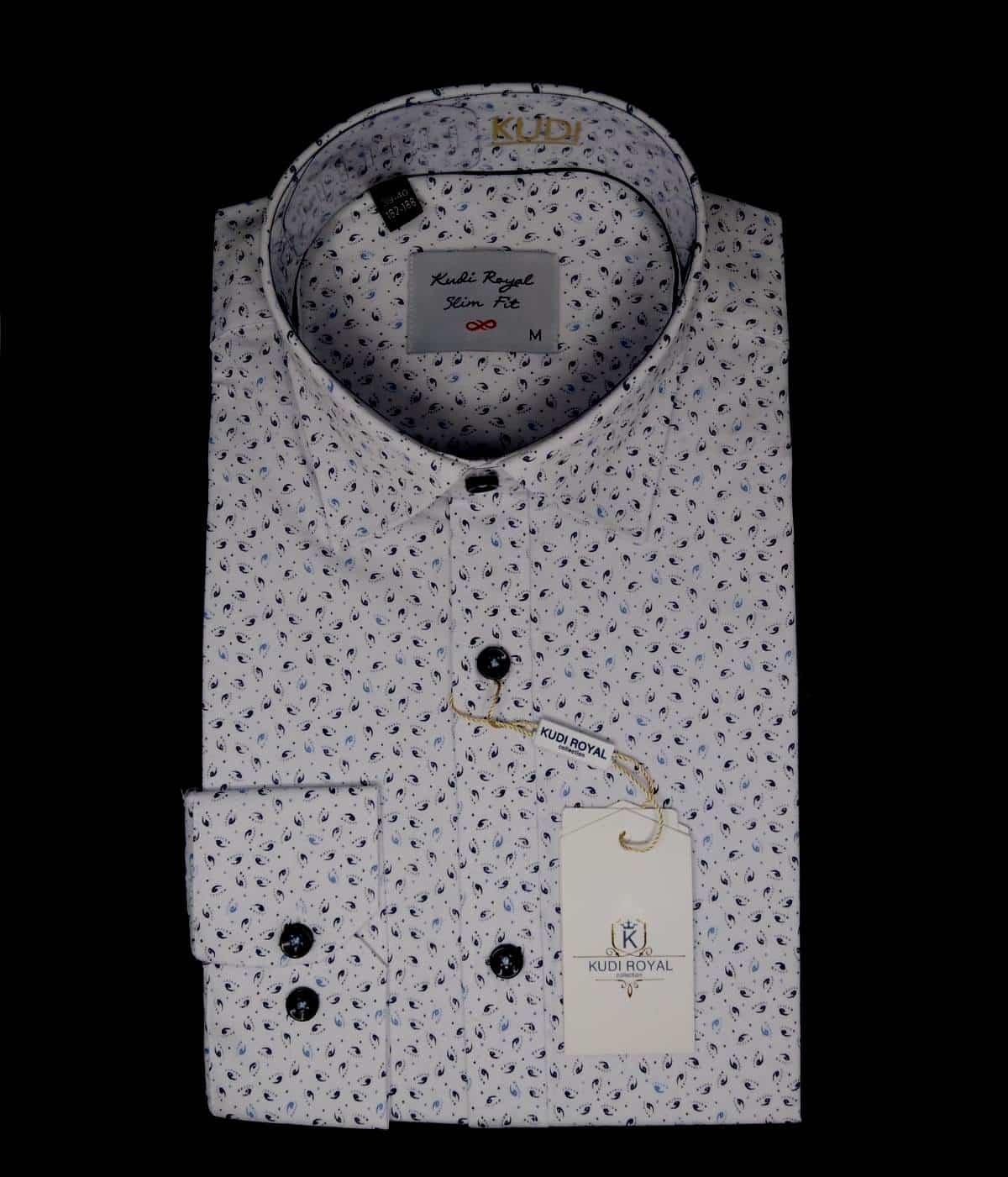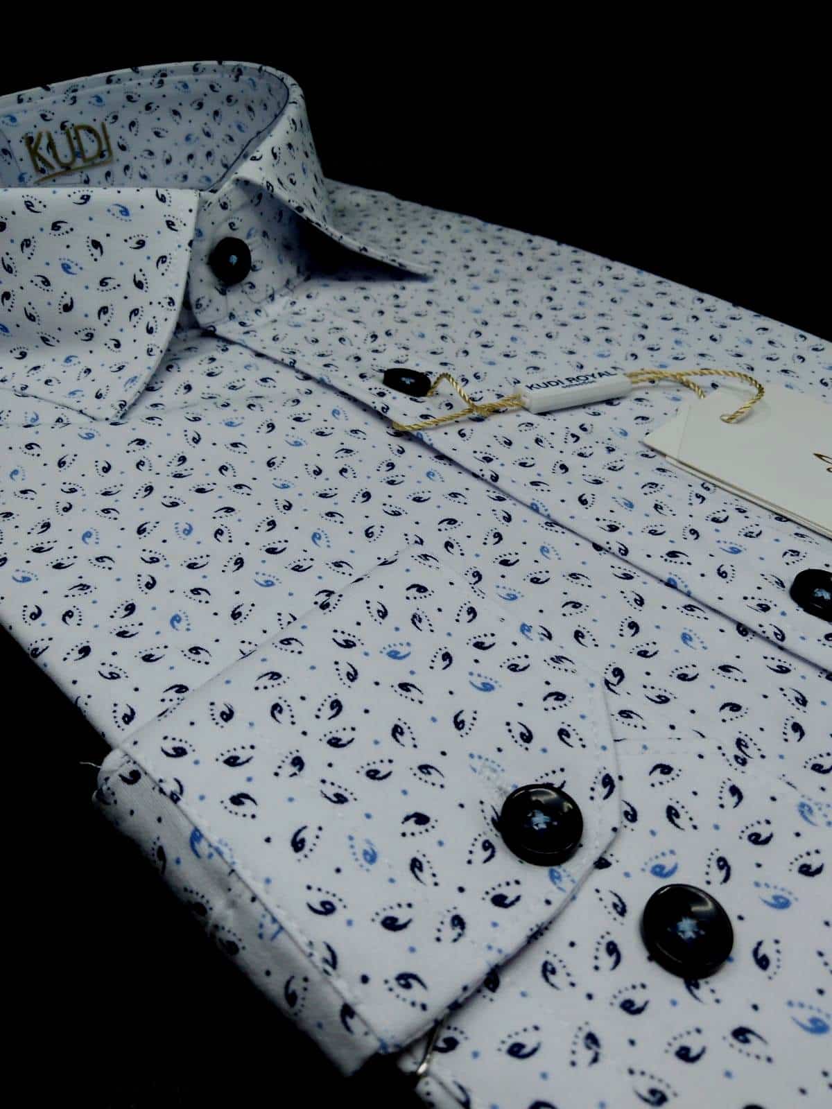 Koszula z najnowszej kolekcji firmy Kudi, biała posiadająca czarno niebieski wzór.