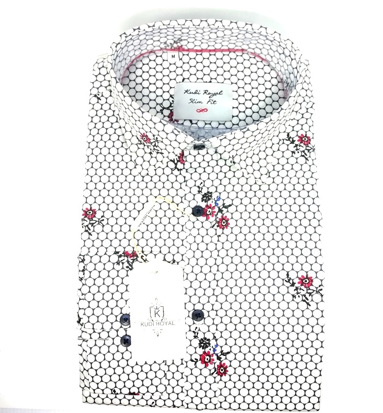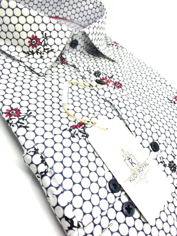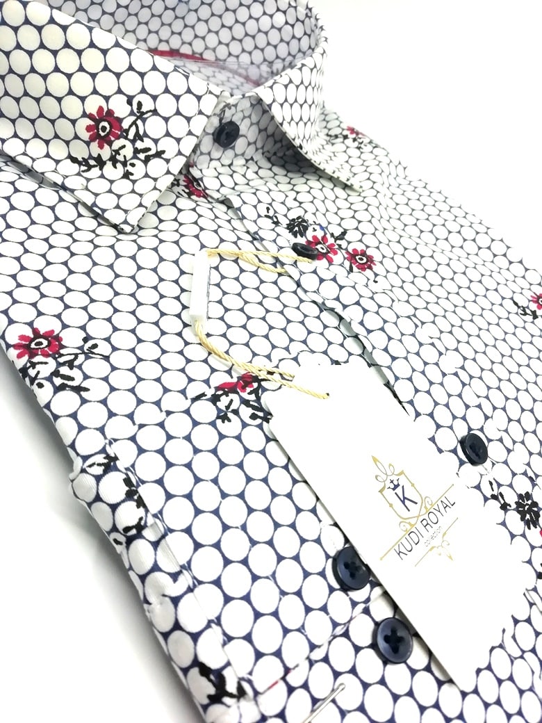 Koszula z najnowszej kolekcji firmy Kudi, biała w kółka i kwatki.