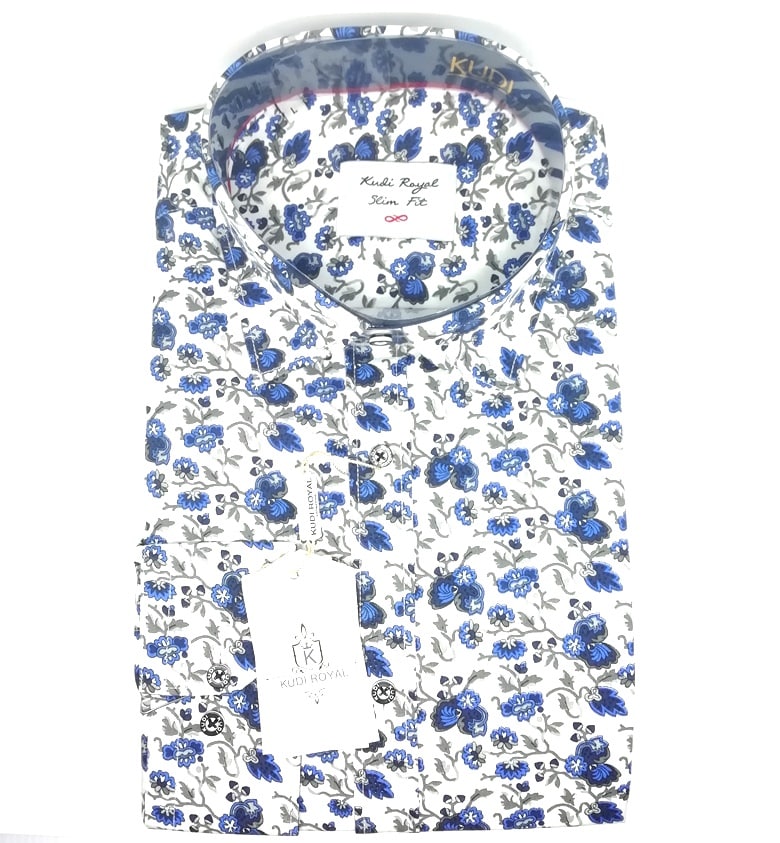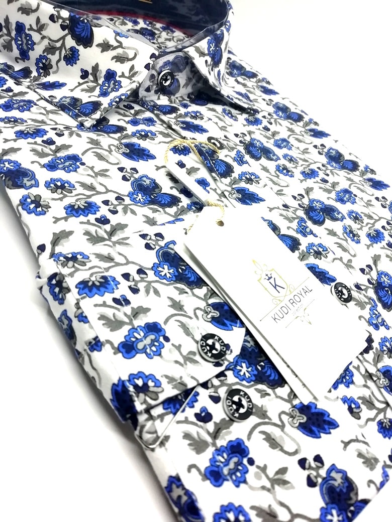 Koszula z najnowszej kolekcji firmy Kudi, biała w niebieskie kwiaty.