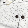 Posiada kołnierzyk z guziczkami pod spodem, w rezultacie można zapiąć tworząc stójkę.
