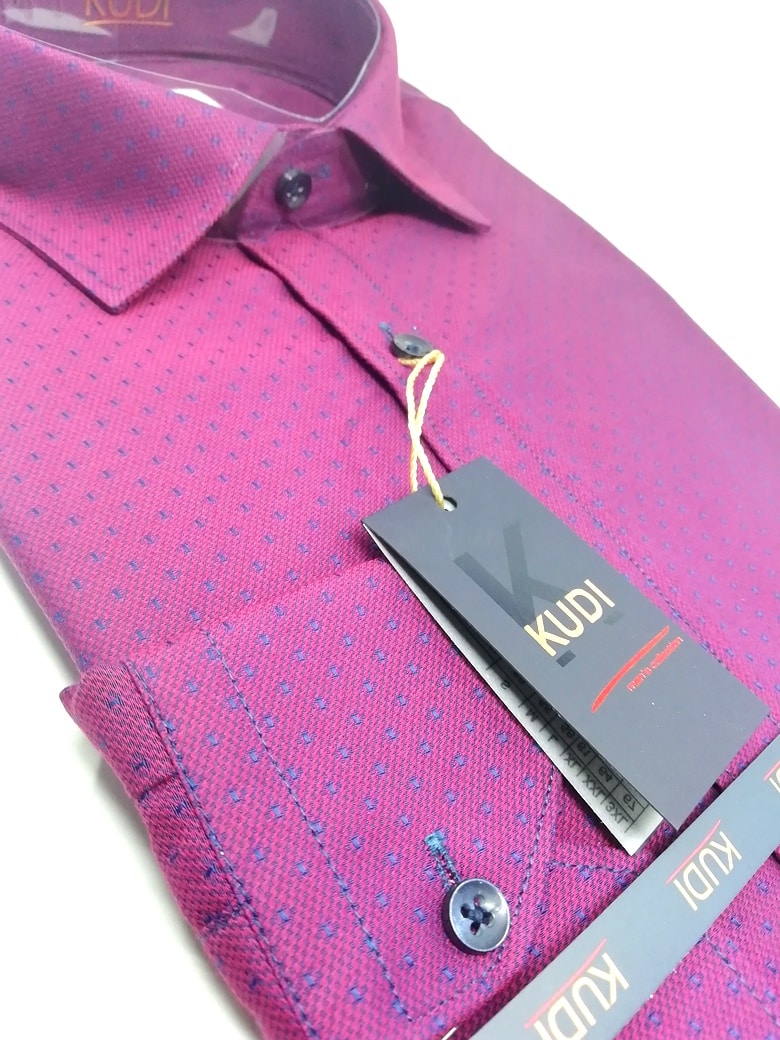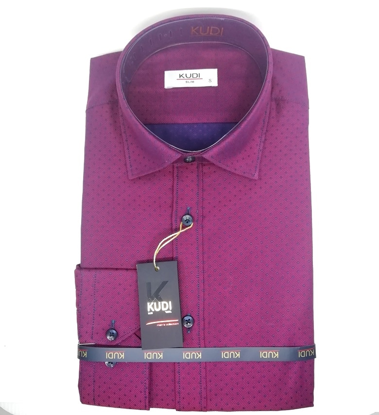 Koszula z najnowszej kolekcji firmy Kudi, śliwkowa we wzór niebieskich kropek.