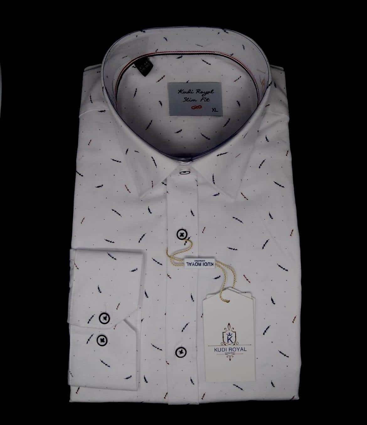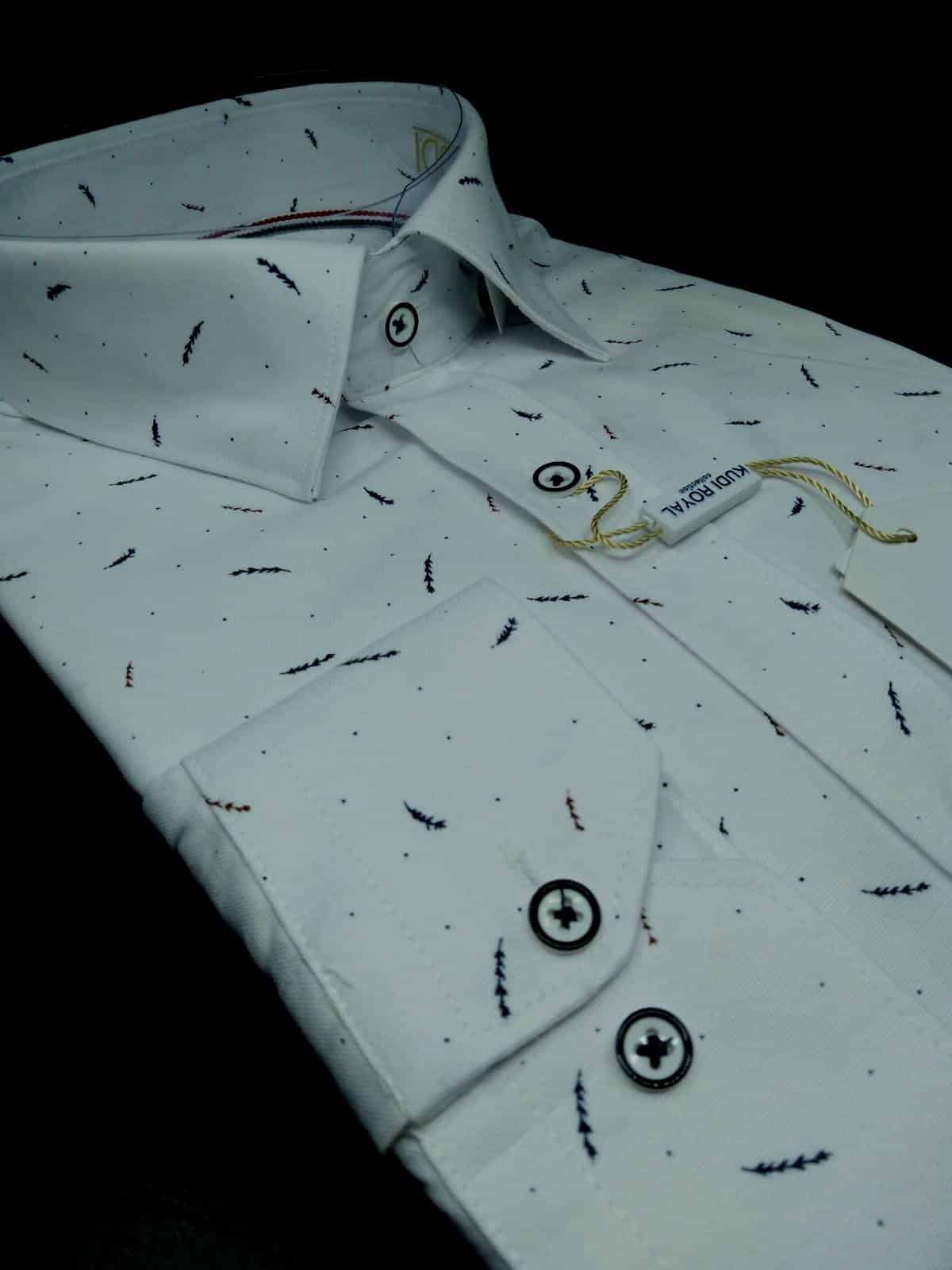 Koszula męska z najnowszej kolekcji firmy Kudi , biała w granatowo brązowe gałązki.