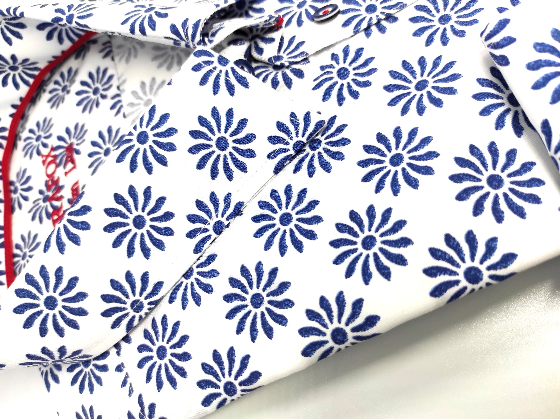 Koszula z najnowszej kolekcji firmy Trafox, biała w niebieskie kwiatki.