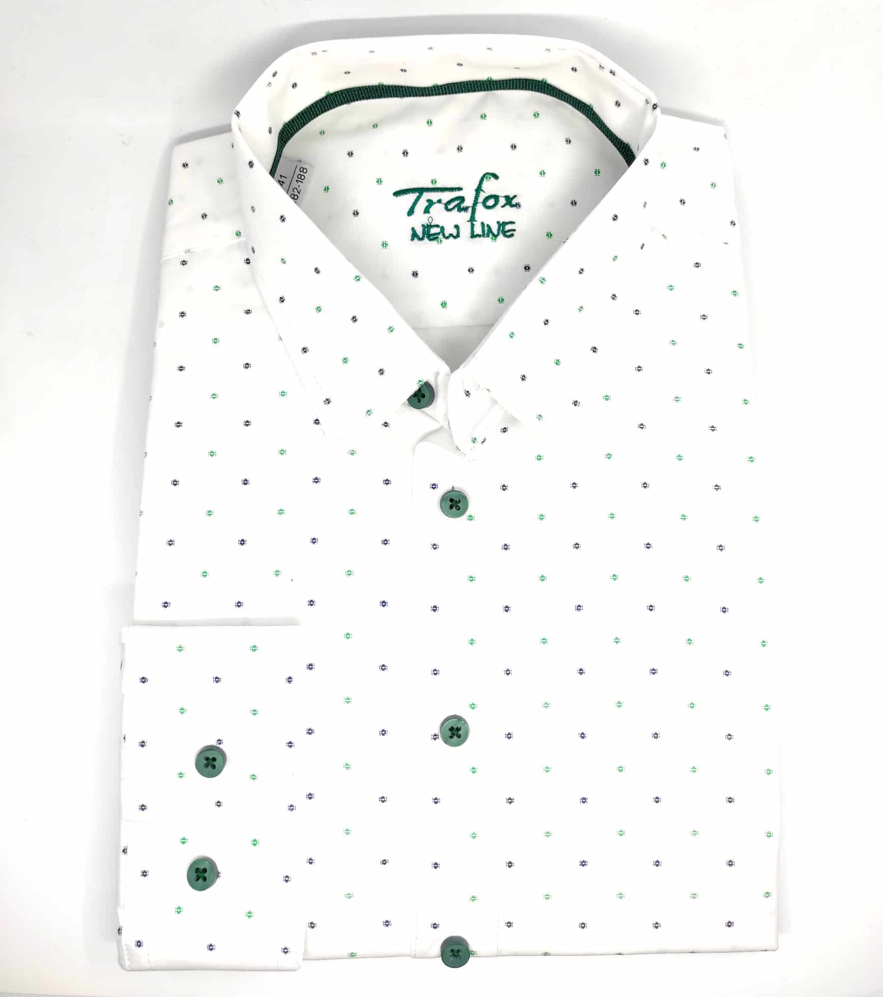 Koszula z najnowszej kolekcji firmy Trafox- biała w zielony i granatowy wzór.